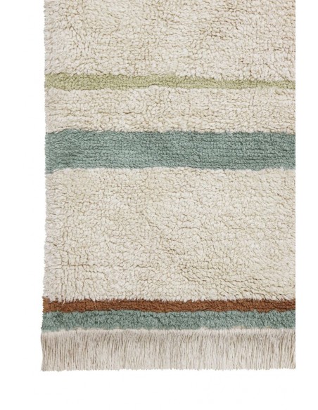 Şeritten ilham alan deseni, Vintage Blue'nun baskın ton olarak öne çıktığı nötr, Doğal renkli bir arka plan üzerinde çeşitli tonlarda özetlenir ve Toffee ve Olive'in yumuşak tonlarıyla eşleştirilir. Her odaya uygun, renkli bir dokunuşa sahip zarif bir halı!