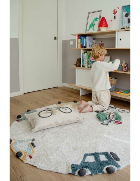 Eko-Şehir'de gezintiye hazır mısınız? Tekerlek olarak spor ponponları, araçlar ve bisikletlerle çevrelenen bu yumuşak, yuvarlak yıkanabilir halının direksiyonuna çocuğunuzun hayal gücü geçsin. Evin herhangi bir yerinde oyun kurmak için uygun bir boyutta gelir. Açık bej, maviler, Zeytin yeşili ve Bal sarısından oluşan sakin bir palete sahip şirin, araç...