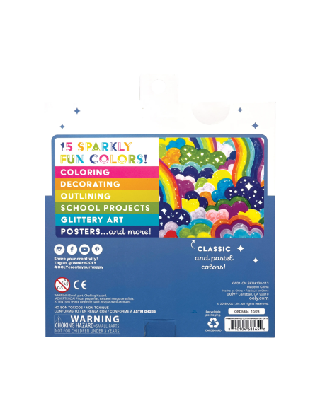 Bu parıltılı marker setiyle sanat projelerine renkli bir ışıltı katın! Bu parıltılı kalemler, size daha fazla seçenek ve daha yaratıcı olanaklar sunan 10 klasik rengin yanı sıra, pastel tonlarında 5 farklı renge de sahip. Her sette 2 mm uç kalınlığında 15 parıltılı marker bulunur.