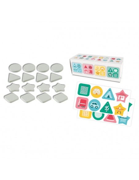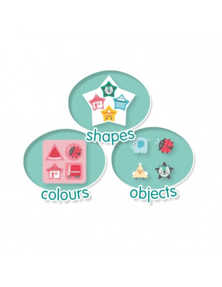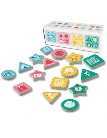 Çocuklara renkleri, şekilleri ve nesneleri öğretmek için harika bir set! Önce kırmızı, mavi, yeşil, sarı renkli diskleri biraraya toplatyalım. Daha sonra farklı şekillerdeki diskleri ve farklı temalara ait nesne dörtlülerini biraraya toplamaya çalışalım. Bu şekilde binaları, araçları, hayvanları ve yiyecekleri biraraya toplayabiliriz. Çocuğunuzla için defalarca oynayabileceğiniz bir oyun. 16 adet oyun diskini saklamak için kutu içerinden çıkan depolama kutusu aynı zamanda oyun talimatlarını da içermektedir.