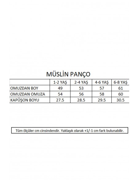 Cıvıl cıvıl renkleriyle plajların gözdesi olmaya aday müslin pançoları denizden ya da havuzdan çıktıktan sonra kullanabilirsiniz. Pamuklu yapısı suyu hızla emer ve rüzgardan minikleri korur. Kapüşonu sayesinde saçlar uzun süre ıslak kalmaz hızla suyu emer aynı zamanda yakıcı güneşten de miniklerin başlarını korur.