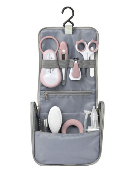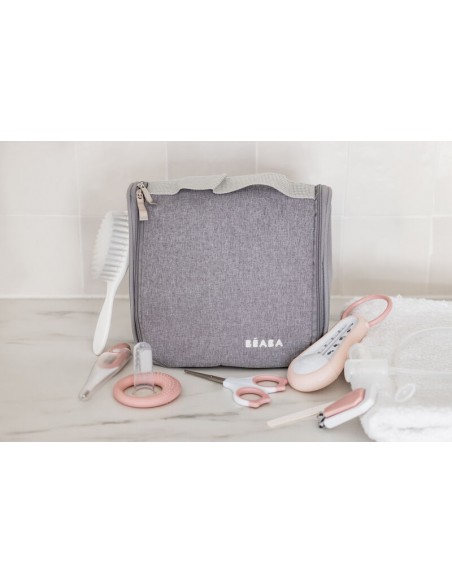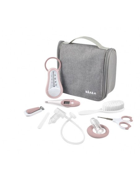 Pembe Béaba bebek bakım seti, aksesuarlarla birlikte: banyo termometresi, dijital termometre, makas, tırnak makası, saç fırçası, diş çıkarma halkası, diş eti fırçası, bebek burun aspiratörü, tırnak törpüsü