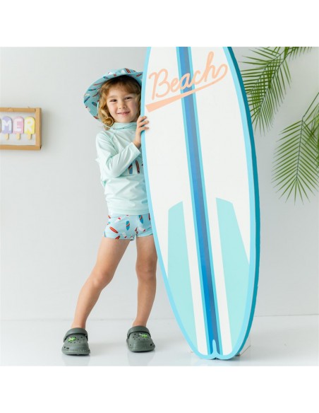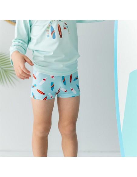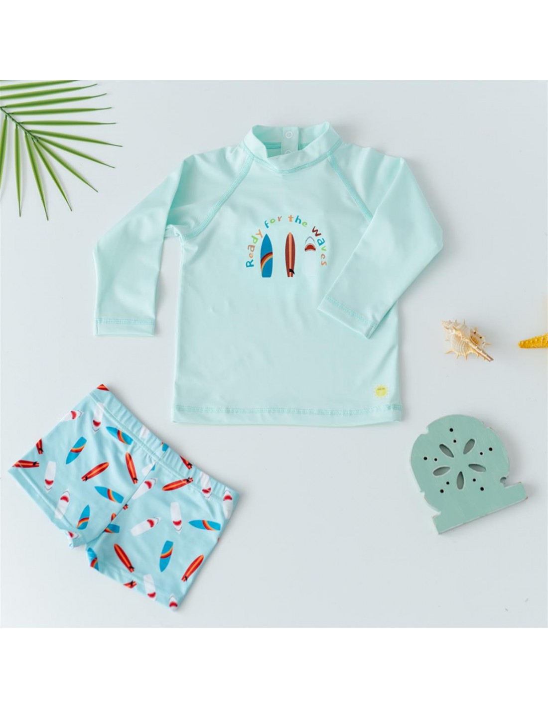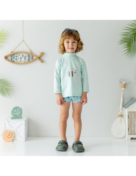 Özel UV uygulama yapılmış kumaştan üretilmiştir. Uzun kollu arkadan çıtçıtlı üst ve şort model alt mayo setidir.
