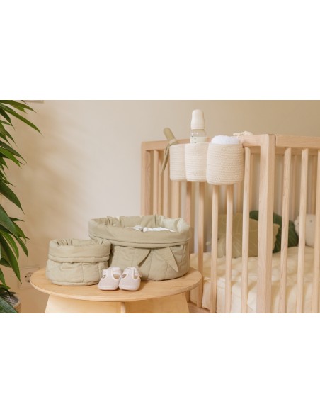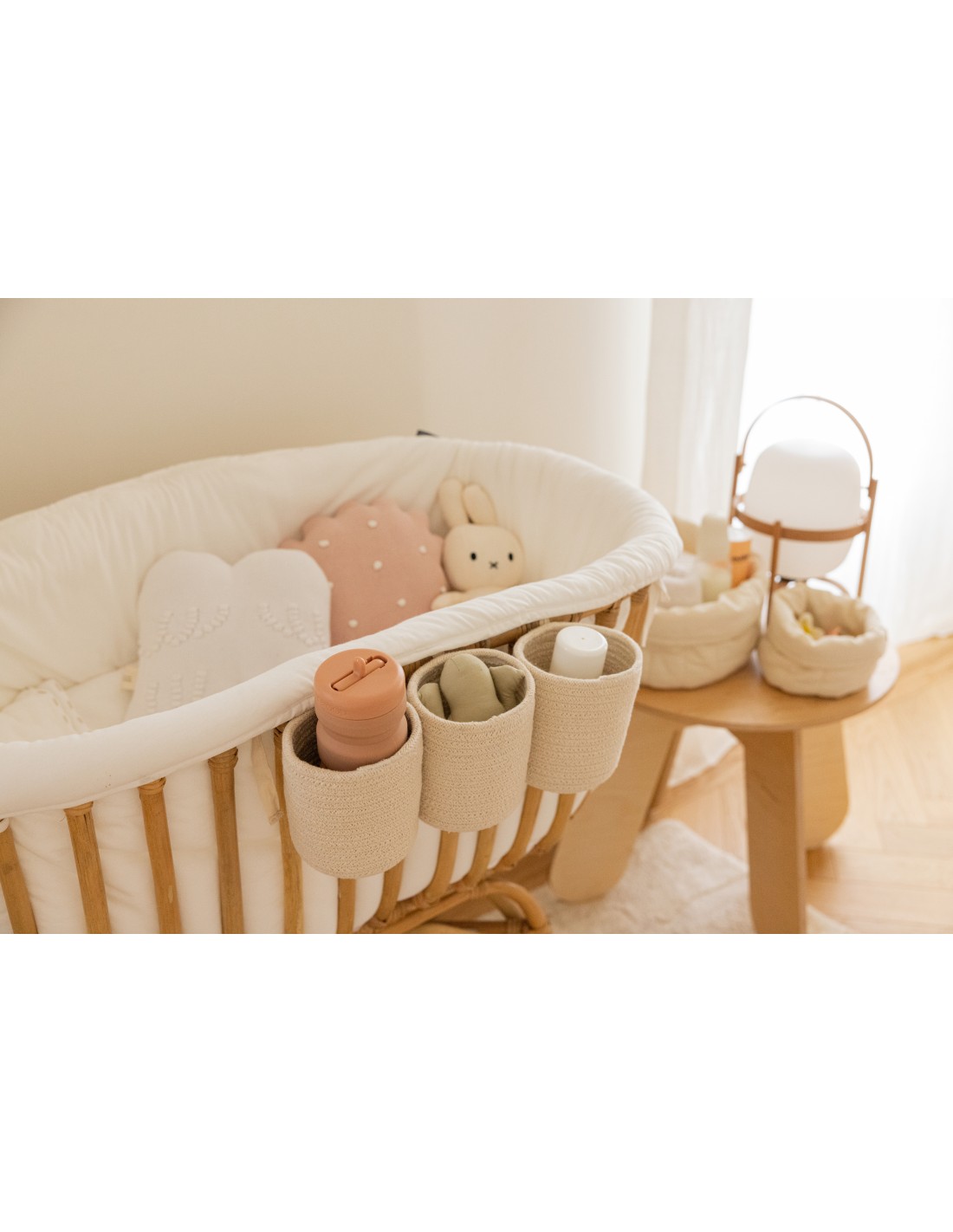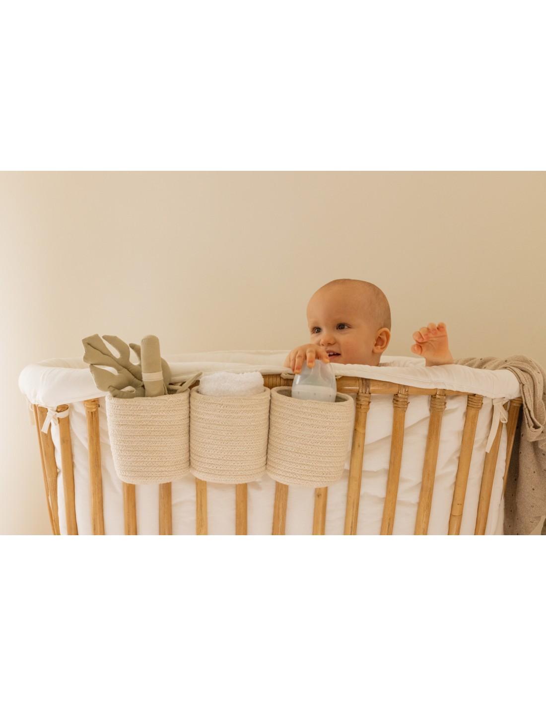 Pamukla kaplı, (Sürdürülebilir) elyaf örgülerden yapılmış, birbirine dikili üç mini silindir asılabilir sepetten oluşmaktadır. Sepet; bebeğinizin biberonlarını, Diş kaşıyıcılarını ve en sevdiği çıngıraklı oyuncakları koyabilmek için beşiğin dış kısmına takılabilecek şekilde tasarlanmıştır. Yumuşak pamuklu kumaş iplerle beşiğe kolayca takılır.