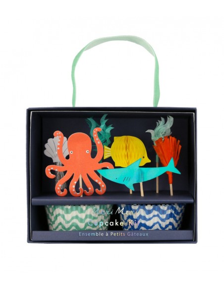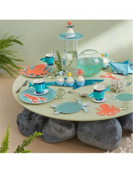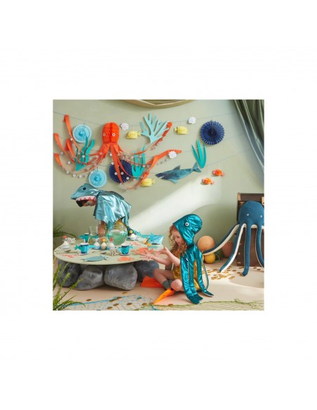 Köpekbalığı ve ahtapot süslerinde parlak mavi ve gümüş renkli holografik folyo detaylar