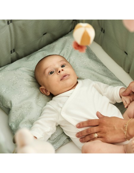 Güçlü kanvas kumaş organik pamuktan yapılmıştır ve havadar polar dolgu sayesinde yatak nefes alabilir. Optimum uyku kalitesini ve karyoladaki sıcaklığın doğal bir şekilde düzenlenmesini sağlamak için koruyucu, sabit bir hava akışı sağladığından karyolanın sadece yarısını kaplar.
