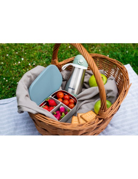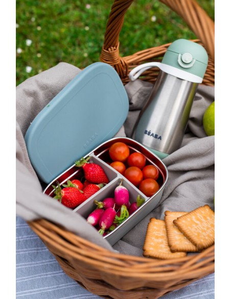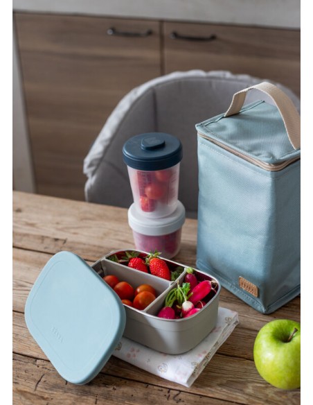 Küçük gurmelerin yemeklerini veya atıştırmalıklarını taşımak için idealdir. Bölmeli paslanmaz çelik saklama kabı ve silikon kapaktan oluşur.