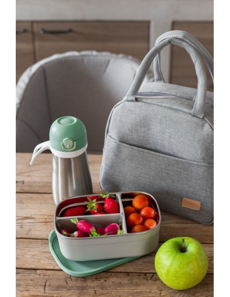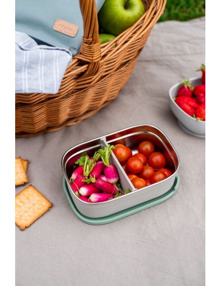Küçük gurmelerin yemeklerini veya atıştırmalıklarını taşımak için idealdir. Bölmeli paslanmaz çelik saklama kabı ve silikon kapaktan oluşur.