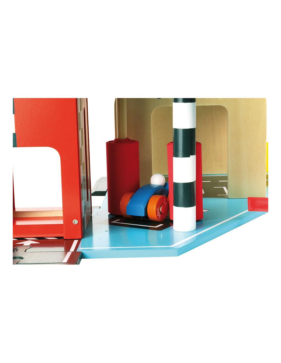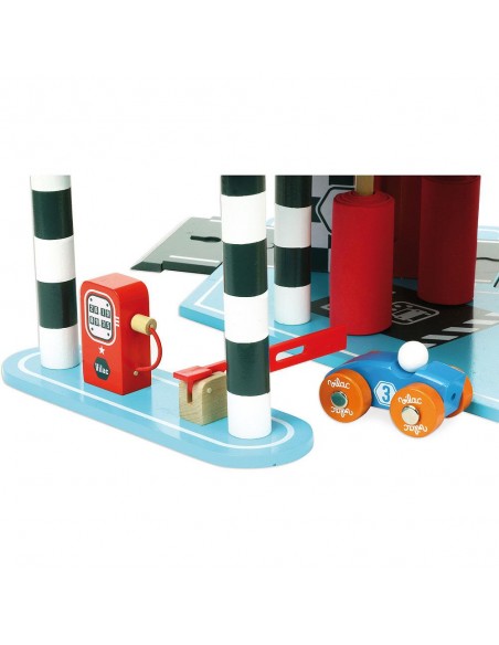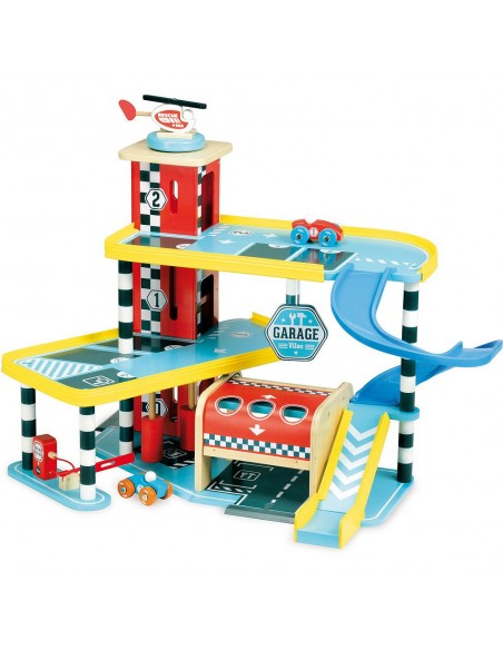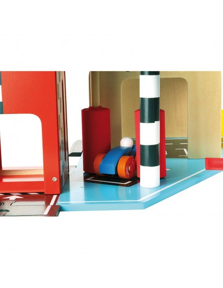 Bu ahşap oyuncak 3 yaş ve üzeri küçük sürücüler için tasarlanmıştır. Çocuklarınız geliştikçe, yetişkinlerin günlük yaşamlarını yeniden ürettikleri, taklit veya sembolik oyunları seveceklerdir. Bu oyunlarla hayal güçlerini harekete geçirebilir ve yetişkinlerin veya diğer çocukların ekleyebileceği senaryolar oluşturabilirler. Bu büyük garajla çocuğunuz asansörü yukarı aşağı hareket ettirerek, araba yıkama silindirleriyle küçük arabasını yıkayarak, benzin (yeşil) doldurup kapıyı açarak, büyük sürgülü kapıyı çalıştırarak, helikopterini çatıya indirerek ve garaj pastasının üzerine krema koyarak, sıçrama tahtasında havalanmak için kendini rampadan aşağı fırlatarak eğlenebilir!