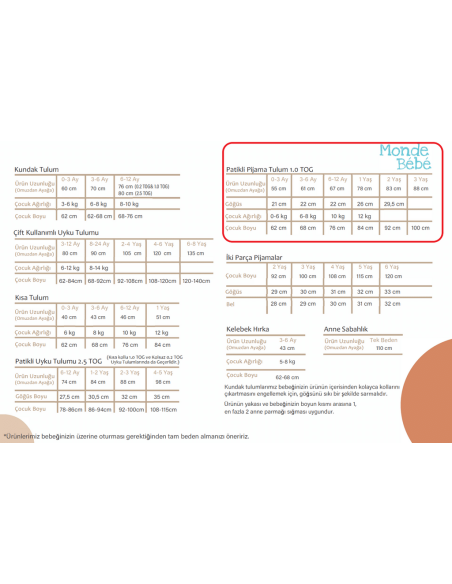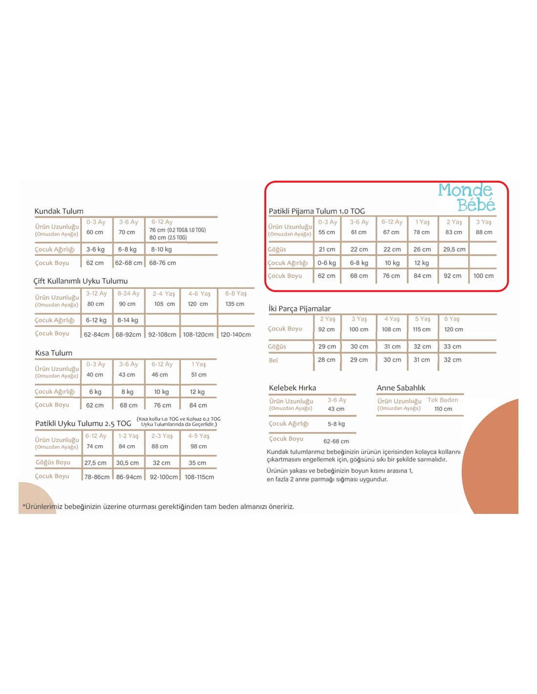 1.0 TOG Organik Pamuklu Pijama Tulumlarımızı bahar aylarında, 22 – 24°C arası oda sıcaklıklarında, içerisine ince bir badi ile rahatlıkla kullanabilirsiniz. Aynı zamanda dilerseniz kundak veya uyku tulumlarımızın altına içlik olarak giydirerek farklı sezonlarda değerlendirebilirsiniz. Uyku sırasında rahatlık ve sıcaklık sağlamak için son derece yumuşak, esnek organik jarse pamuktan yapılmıştır. Dar kesim tasarımlar, tulumunun toplanmasını önler ve nefes alabilen yapısı fazladan bir örtü gerektirmeden çocuğunuzun terlemesini/üşümesini önlemeye yardımcı olur. 1.0 TOG dolgusuzdur, ince bir hırka kalınlığındadır. Ürünün fermuarları üç yönlüdür, iki adet fermuar cebi bulunmaktadır. Fermuarların ikisini de bebeğin göğsünde bulunan ön cebe, belinde bulunan arka cebe veya ağ kısmına getirebilir, bebeğinizin altını kolaylıkla değiştirebilirsiniz.