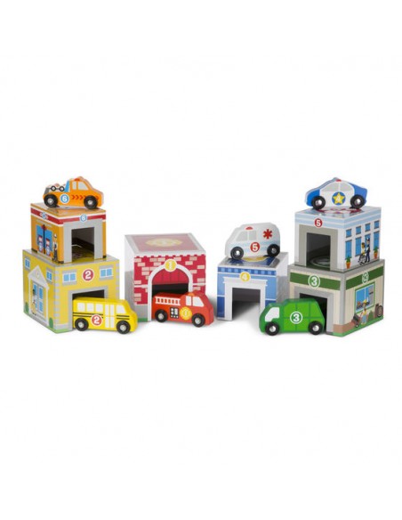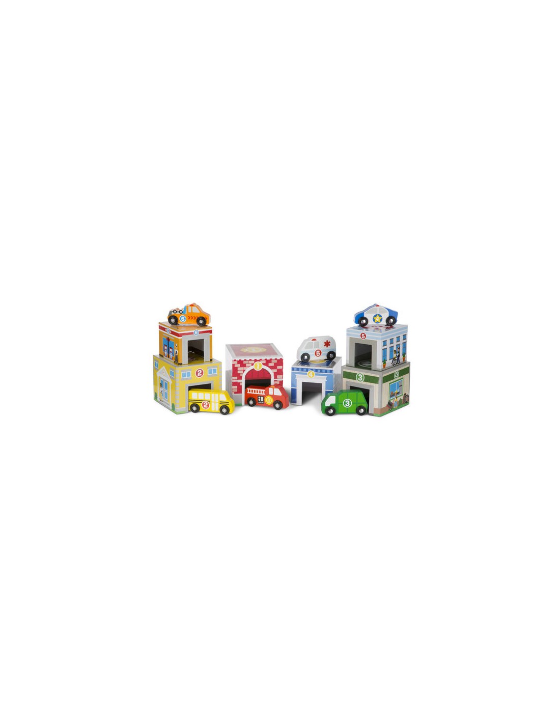 Farklı renk ve büyüklükte hastane, okul, itfaiye istasyonu gibi 6 bina ve bu binalarla ilgili 6 tekerlekleri dönebilen ahşap araç ile diz oyna kuleler. Çocuklar rakamları,renkleri, binalarla araçları eşleştirecekler, dizecekler, ahşap araçlarla farklı oyunlar geliştirecekler. Bu üründe toksik olmayan boyalar kullanılmıştır, gerekli Avrupa Birliği ve ABD oyuncak güvenlik standartlarına uygundur.