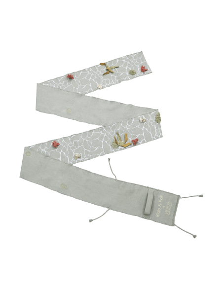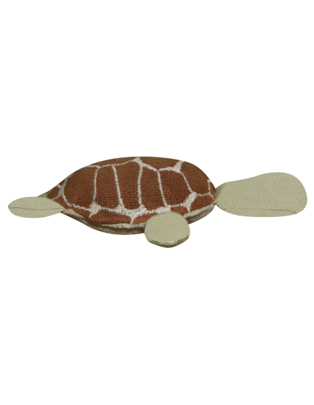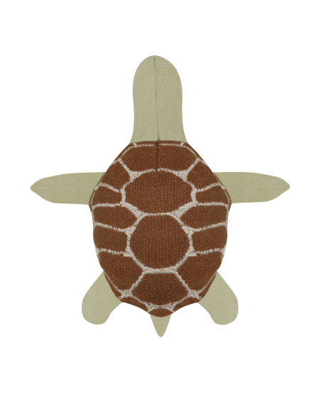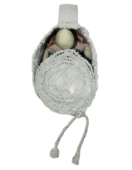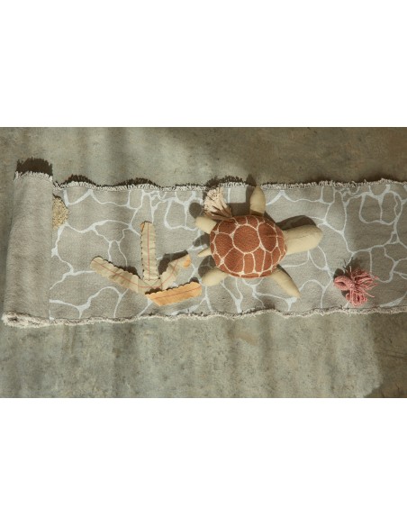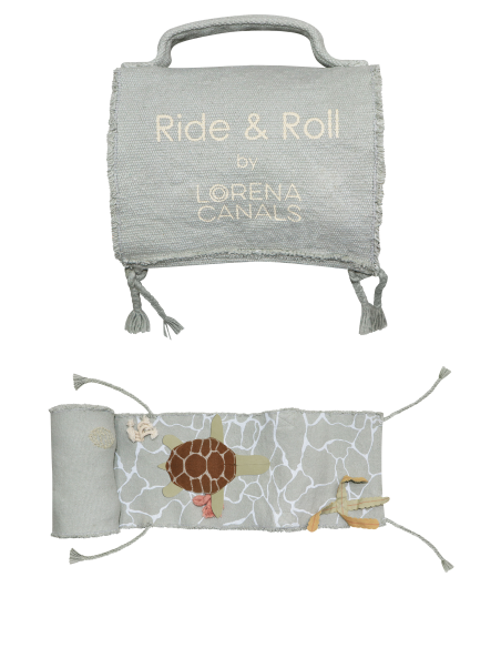 Yeni doğmuş kaplumbağanın okyanuslardaki yolculuğuna katılın! Ride&Roll Turtle, zeytin yeşili patileri ve işlemeli kabuğu olan, pamuklu kanvastan yapılmış yumuşak bir oyuncak kaplumbağadan oluşur. Kaplumbağa, 4 metre uzunluğunda, mavi adaçayı renginde kanvas rulo halinde sarılmış olarak geliyor; rengarenk mercanları ve üstüne basılan suyun yansımalarıyla deniz dibinin büyülü dünyasını ön plana çıkarıyor. Kenarlarında örgülü ipler bulunan bu çanta, kolayca yuvarlanıp kaplumbağa ile birlikte bağlanarak pratik bir evrak çantasına dönüştürülebilir.
