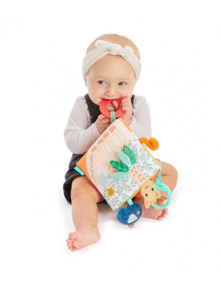 Kitabın çıkıntılı kısımları bebeği sayfaları çevirmeye ve farklı sürprizler keşfetmeye teşvik ediyor: Bir bulutun arkasına saklanan kuş Kiwi, yapraklarla saklambaç oynayan Sophie laGirafe çıtırdayan kum piramidi...