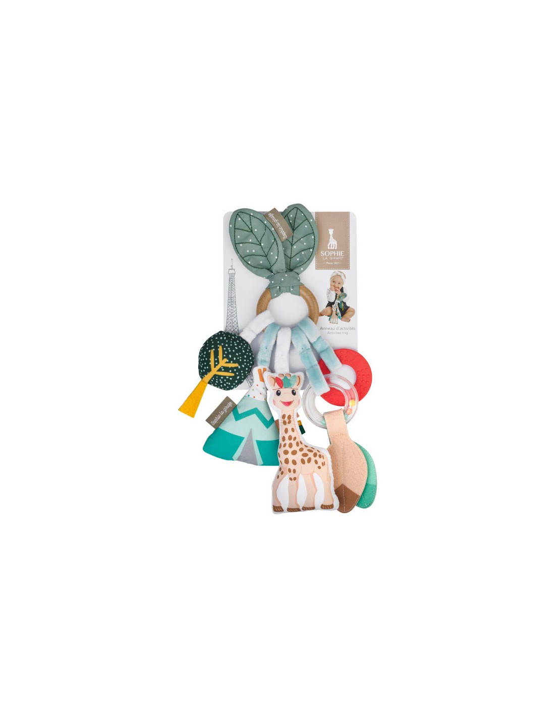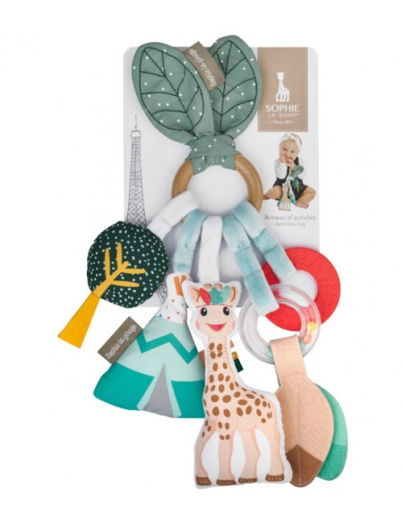 Bebek, ahşap halkanın etrafındaki çok sayıda aktivite sayesinde duyularını ve motor becerilerini geliştirir: şeffaf çıngırak, düdük, zil, buruşuk kağıt, etiketler, diş kaşıyıcı...