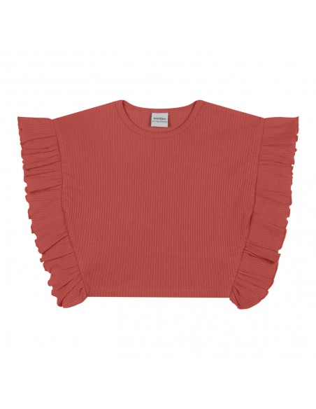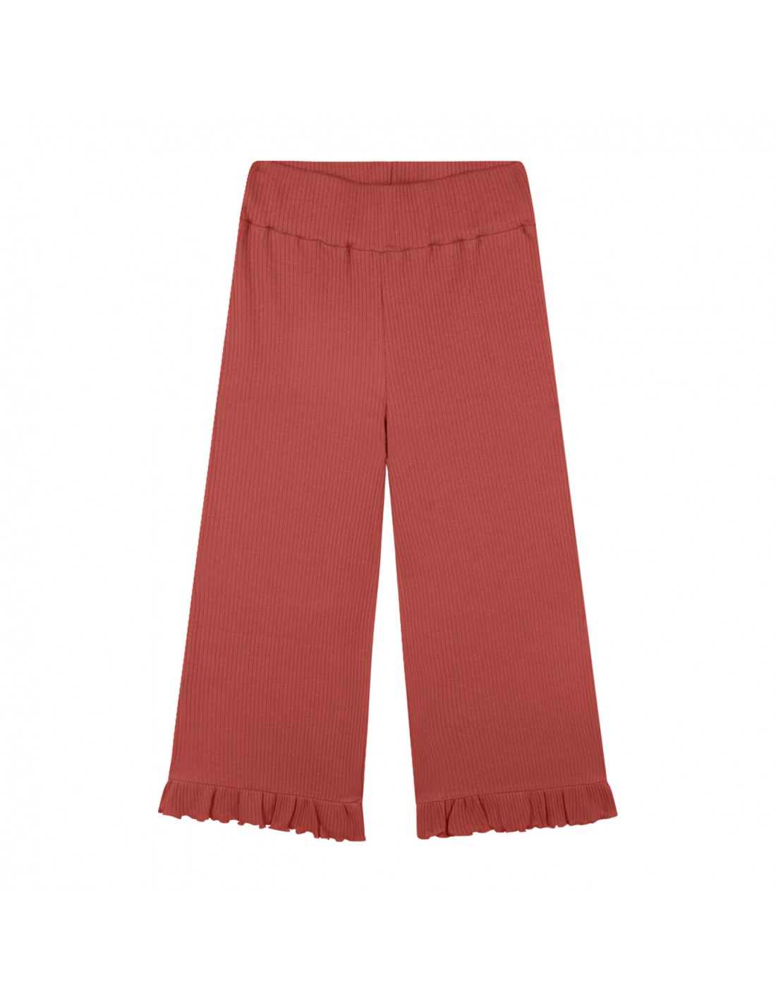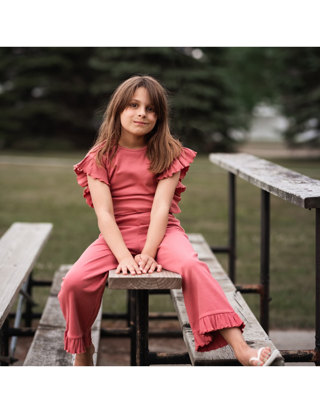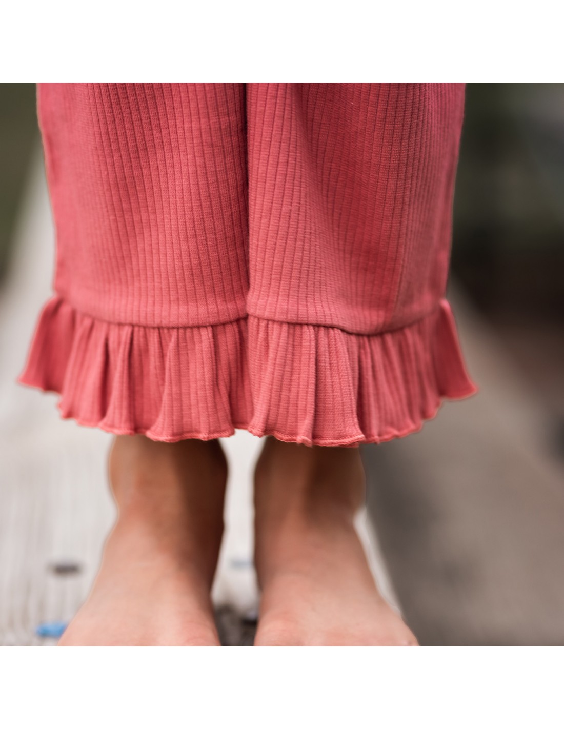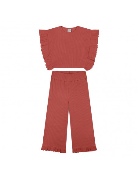 İki parça fırfırlı kısa bluz, fırfırlı bol paça pantolon set.