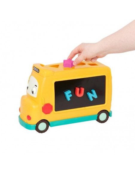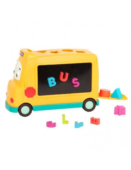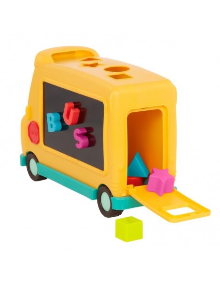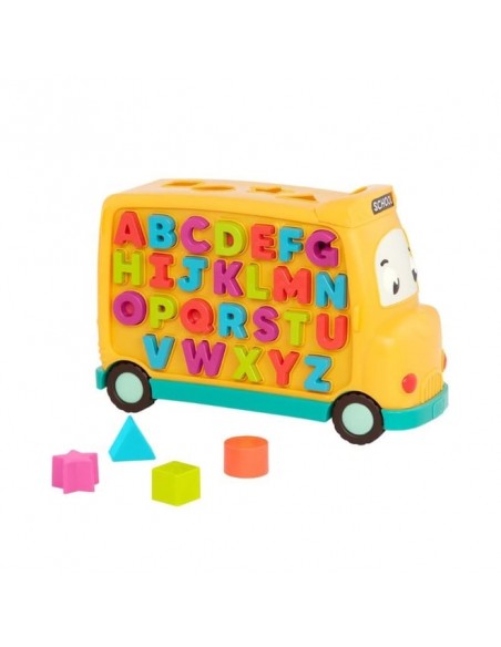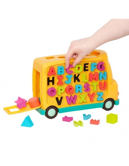 Oyuncak okul otobüsü, 26 tutması kolay mektup parçası ve 4 renkli şekille birlikte gelir.