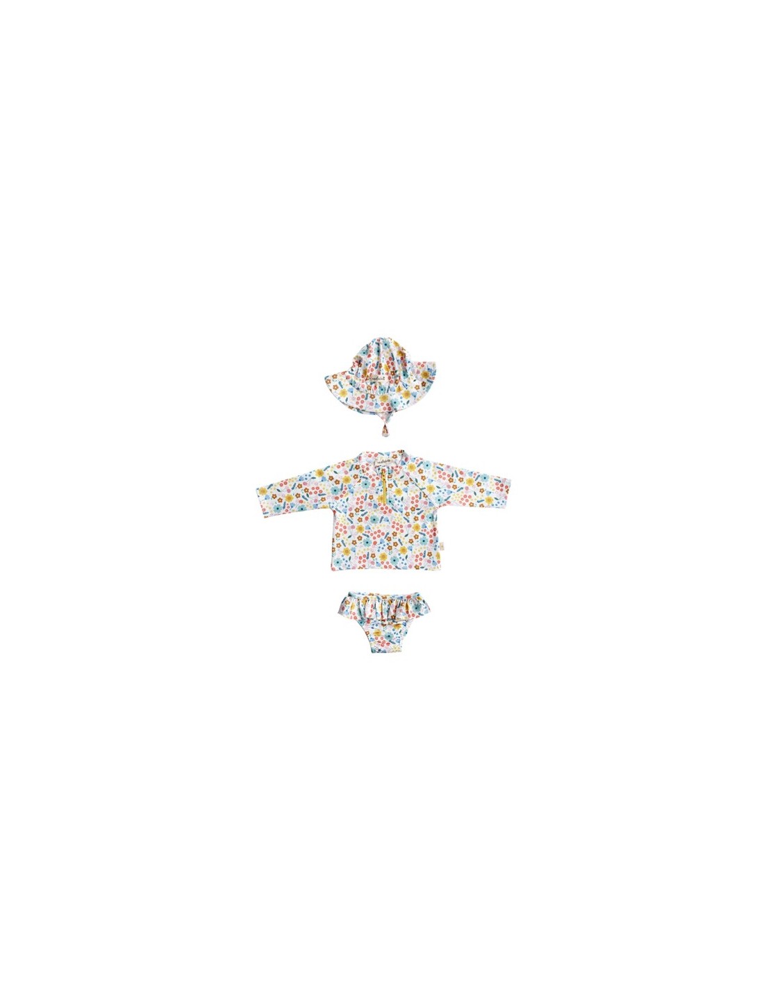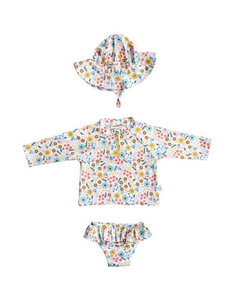 Set içerisinde önü fermuarlı uzun kollu mayo T-shirt, fırfır detaylı bikini altı ve bağcık kısmı stoperle ayarlanabilir siperlikli şapka bulunmaktadır.