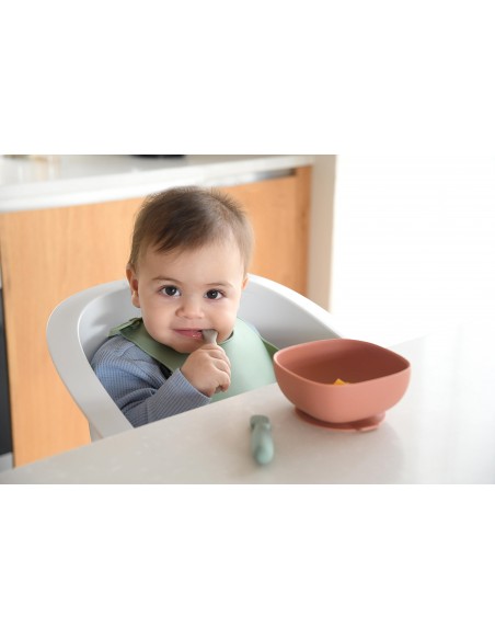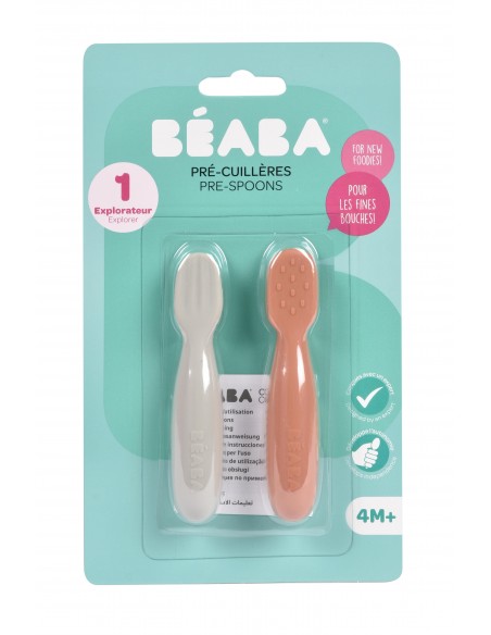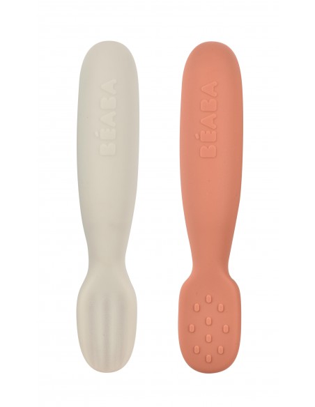 Az hacimli, kısa, yuvarlak sap bebeğin kaşığı 3 farklı şekilde kavramasını sağlar (avuç içi tutuşu, kıskaç tutuşu veya yumruk tutuşu). Dokulu uçlar (dalgalar ve çıkıntılar) yiyeceklerin tutuşunu optimize etmek için tasarlanmıştır.Düz uçlar, kaşığın aşırı dolmaması için her iki tarafta da kullanılabilir ve bileğin döndürülmesini gerektirmez.