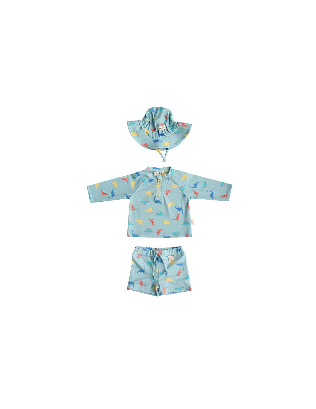 Set içerisinde önü fermuarlı uzun kollu mayo T-shirt, slip şort ve bağcık kısmı stoperle ayarlanabilir siperlikli şapka bulunmaktadır.