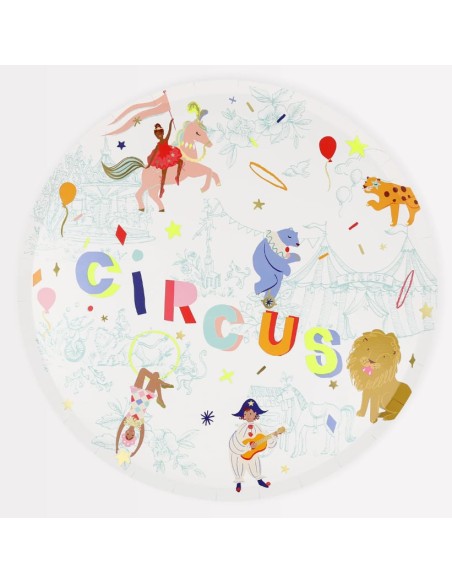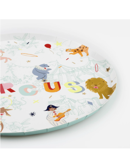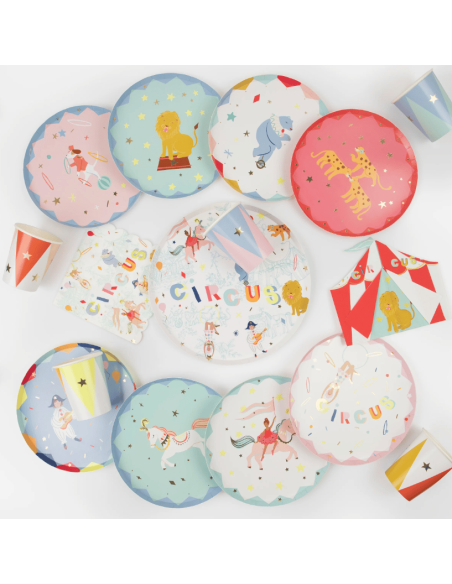 Bir sirk partisinin tüm eğlencesi için yuvarlanın, yuvarlanın! Bu çok özel yemek tabakları, eğlenceli grafikler ve illüstrasyonlarla kaplanmış geleneksel bir toile sirk deseni içeriyor ve onları klasik bir sirk temasına yeni ve çağdaş bir yaklaşım haline getiriyor. Konuklarınızı memnun edeceği garanti.