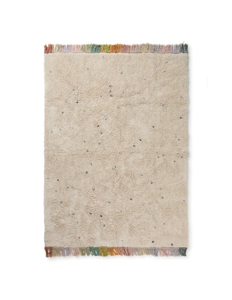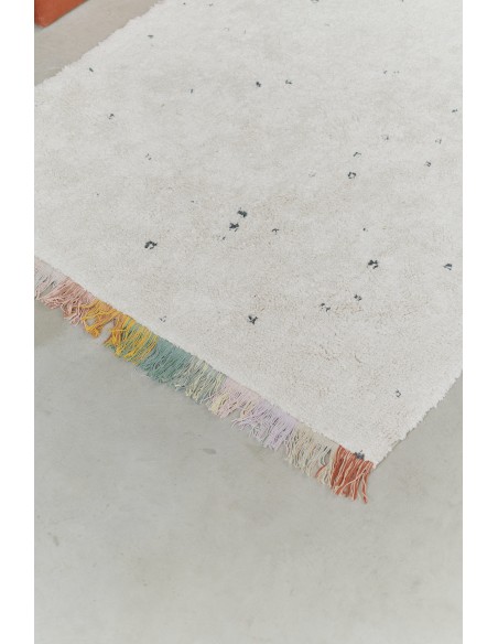 Yıkanabilir Halı Stardust ile yıldızların arasında sallanın. Geniş alandaki yıldız tozunu simüle eden küçük koyu noktalara sahip, doğal renkte el yapımı dikdörtgen pamuklu halı.