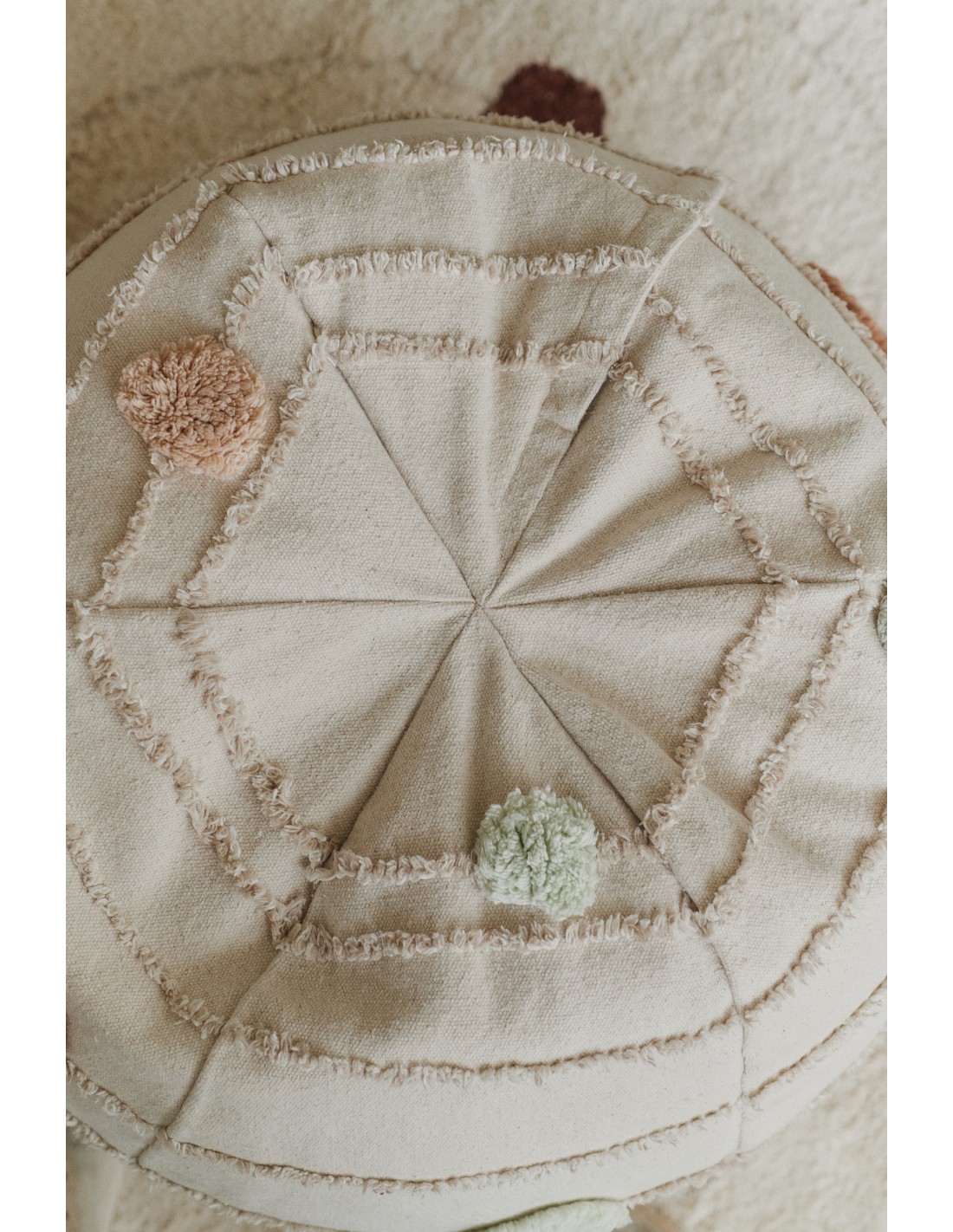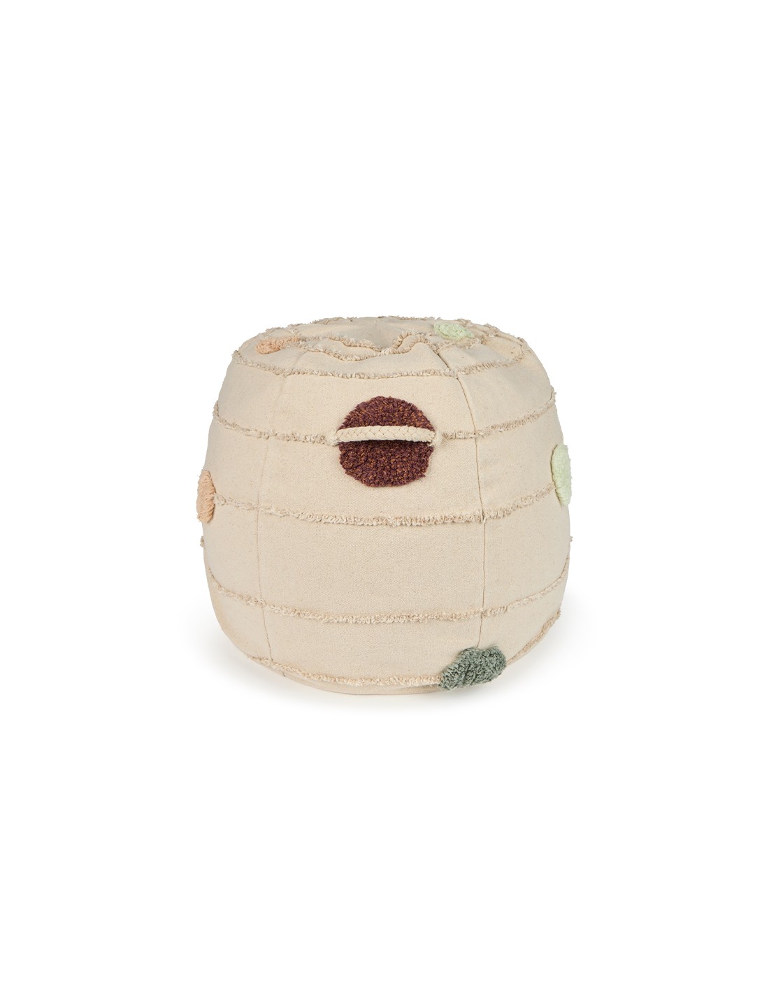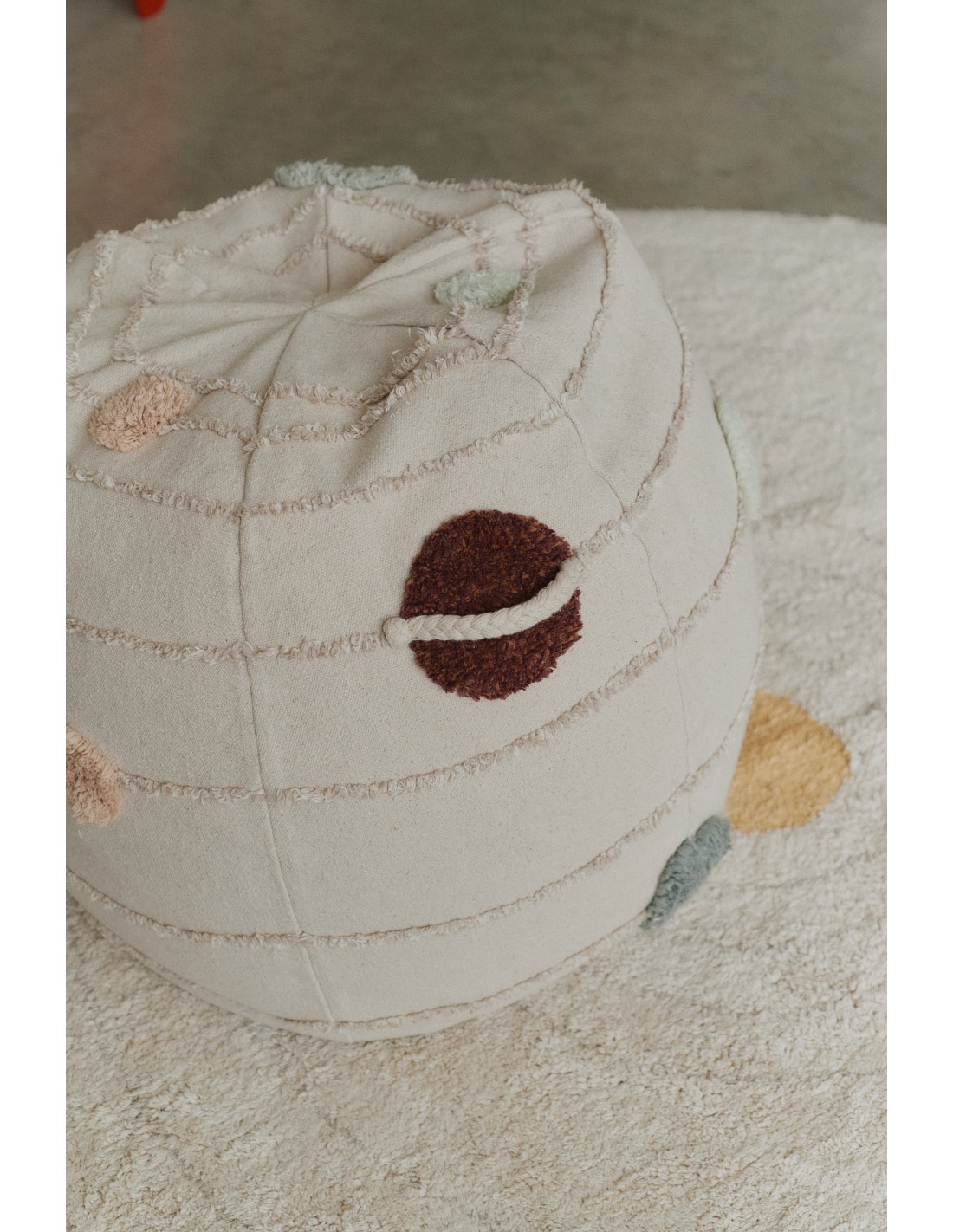 Puf Güneş Sistemi ile kozmik konforu keşfedin! Güneş Sistemi'nden ilham alan yuvarlak el işi puf. Doğal tuvalde, gezegenleri ve yörüngelerini temsil eden, püsküllü çizgiler ve orman gülü, bal, mavi adaçayı veya marshalla gibi renkli daireler.
