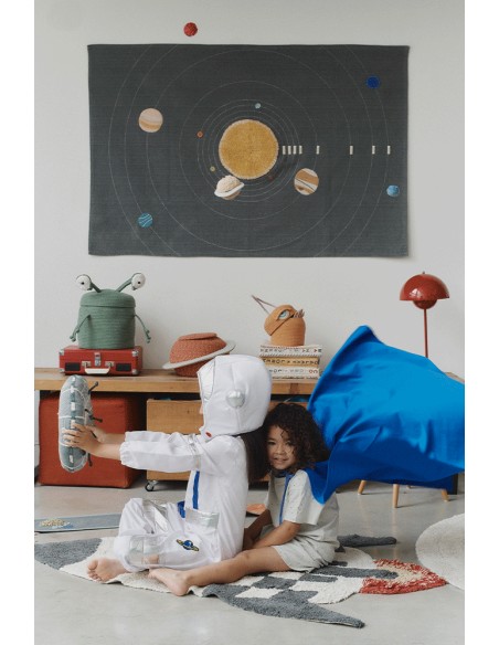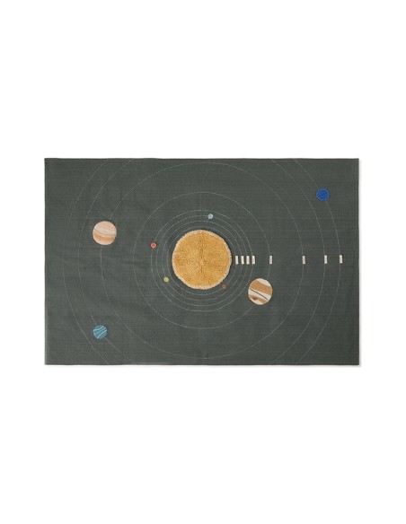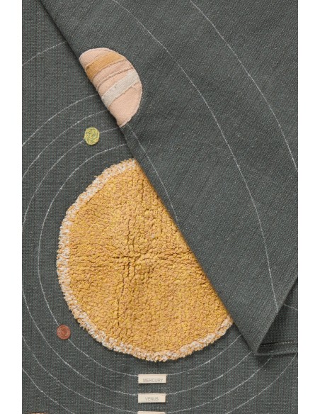 Merkezinde, birbirine dikilmiş yörüngeler ve çeşitli renk tayfındaki gezegenlerle çevrelenmiş püsküllü sarı bir güneş yatıyor. Her gezegen, iplik dikişi, tafting ve farklı kanvas tabanlar, kordonlar ve iplik nakışları kullanılarak daha büyük gezegenlerin dikkatli el işçiliği gibi teknikler kullanılarak benzersiz bir şekilde işlenmiştir.