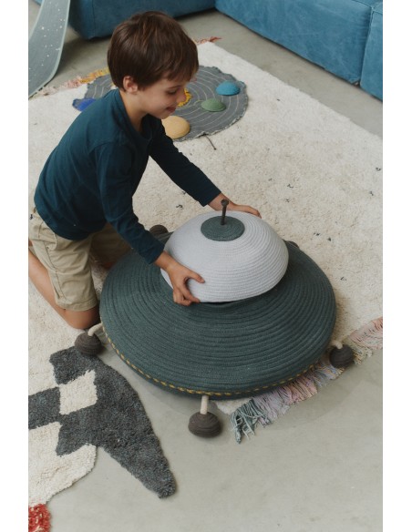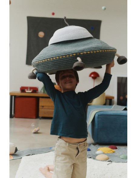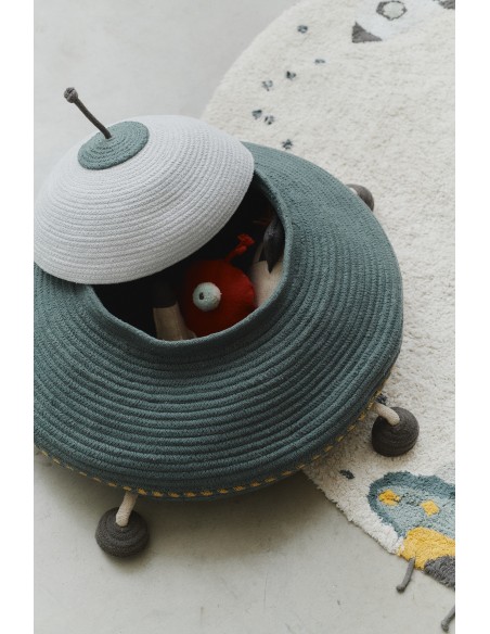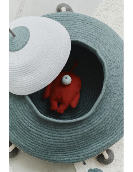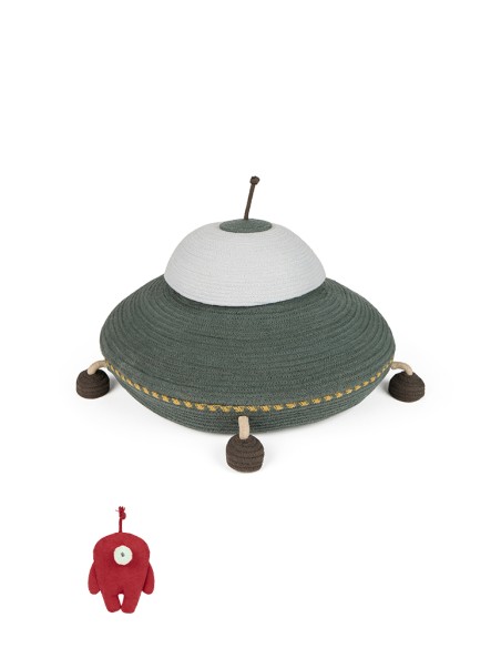 Bu büyük el işi sepet, UFO şeklindedir ve pamuklu iplerden yapılmıştır ve geri dönüştürülmüş PET malzemelerle doldurulmuştur. Mükemmel bir iniş için hareketli bacaklara, galaksinin en uzak köşelerinden sinyalleri almak için bir kablo antene ve bir grup oyuncak, kitap veya küçük kaşifinizin keşfettiği herhangi bir kozmik hazineyi taşımak için geniş depolama kapasitesine sahiptir!
