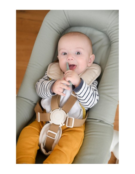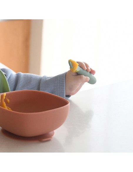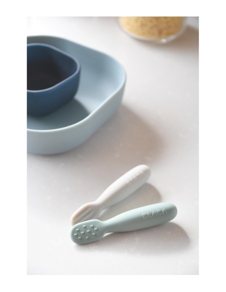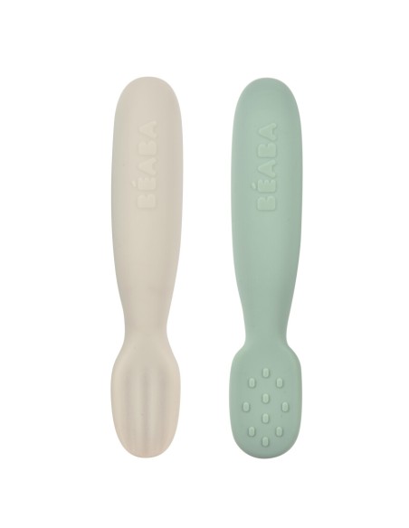 Az hacimli, kısa, yuvarlak sap Bebeğin kaşığı 3 farklı şekilde kavramasını sağlar (avuç içi tutuşu, kıskaç tutuşu veya yumruk tutuşu).Dokulu uçlar (dalgalar ve çıkıntılar) yiyeceklerin tutuşunu optimize etmek için tasarlanmıştır.Düz uçlar, kaşığın aşırı dolmaması için her iki tarafta da kullanılabilir ve bileğin döndürülmesini gerektirmez.