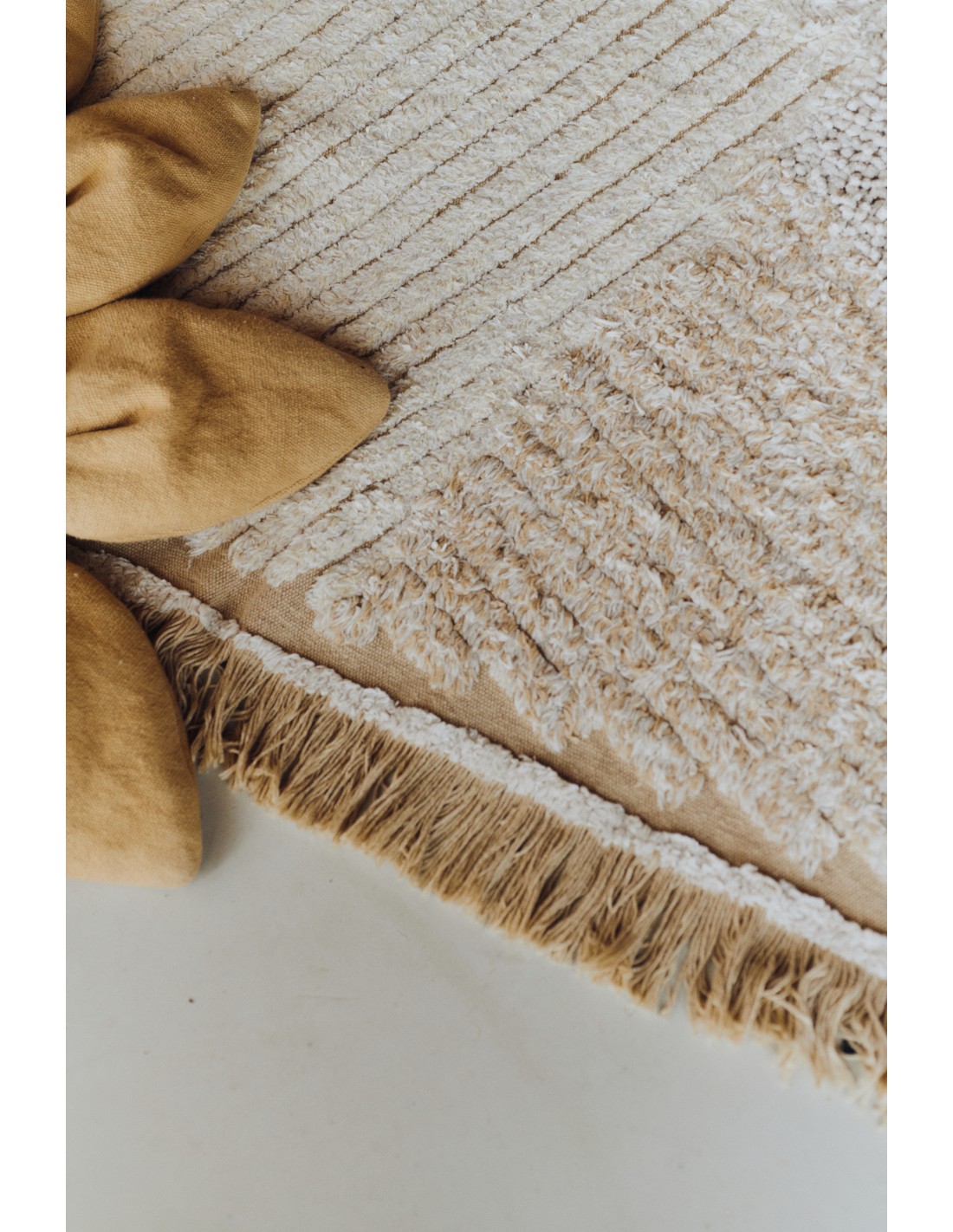 Bal rengi bir kanvasla pamuktan el işçiliğiyle üretilen bu halı, meraklı küçük ellerin keşfetmesi için çeşitli dokular sunar
