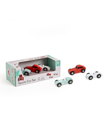 Classic World Ahşap Spor Araba Seti, bir roadster, bir spor araba ve bir yarış arabasından oluşuyor. 1950'lerden ilham alınarak tasarlanan bu küçük arabalar, Classic World’ün oyuncak tren raylarında da kullanılabiliyor.