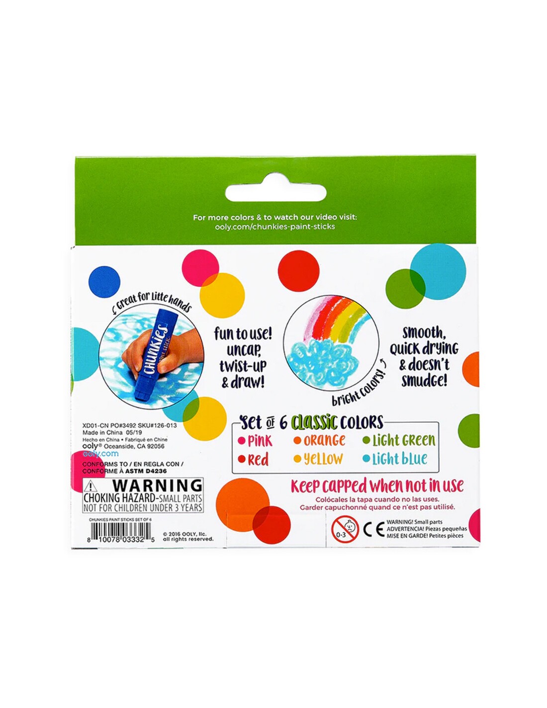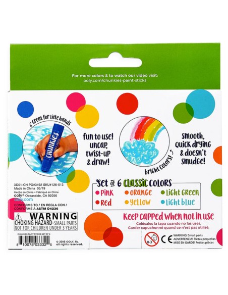 Chunkies boya seti, her biri kalın uçlu plastik bir muhafaza içinde 6 farklı renkli boya içerir. Küçük sanatçılar boyama yapmayı sevseler de, ebeveynler ortaya çıkan dağınıklıktan pek de hoşlanmayabilirler. Her biri kalın uçlu plastik bir muhafaza içinde yer alan ve kolay tutuşu imkan sağlayan Chunkies boyalar ise boyayı kağıt üzerinde uygulamaya ve duvar gibi farklı yüzeylerden uzak tutmaya imkan sağlar. Hızlı kuruyan renkler sayesinde istenmeyen lekelerinde önüne geçilir. Bu sayede resimler bittikten sonra neredeyse anında asılmaya hazır hale gelir.