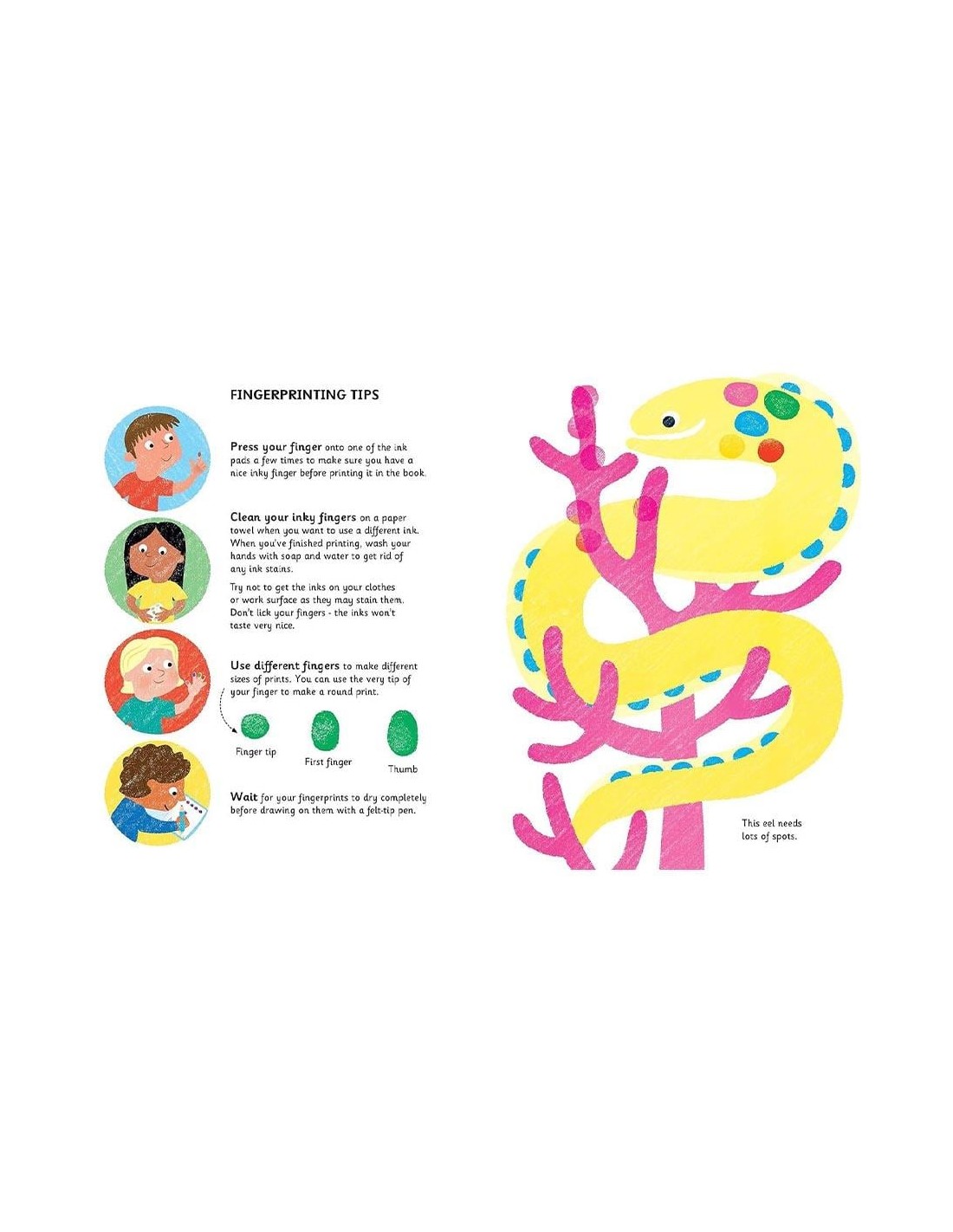 Bursting with fun fingerprinting ideas, this colourful activity book comes with its own inkpad of seven bright colours. Decorate the underwater scenes with sharks, seahorses, narwhals, penguins and even a sunken ship. There are simple instructions showing how to fingerprint each creature and the book has a spiral binding so that it lies flat.