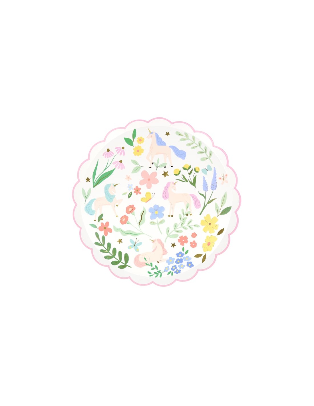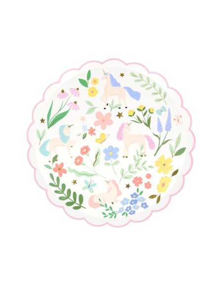 Şık taraklı bir bordüre sahip bu kağıt yan tabaklar, unicorn veya prenses partinizi anında büyülü gösterecek.