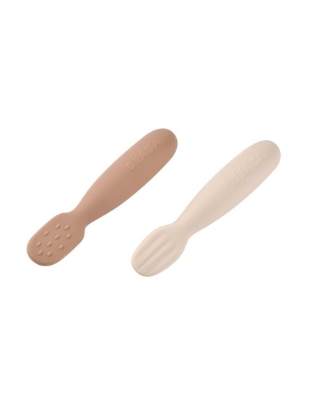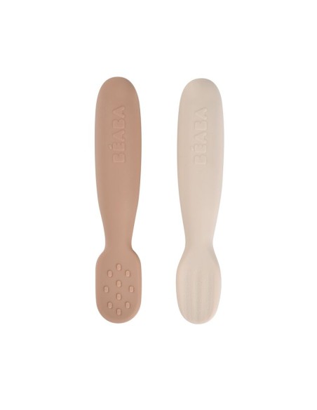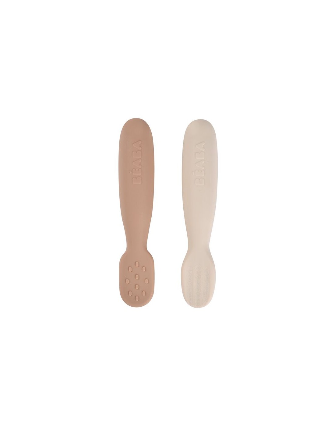 Az hacimli, kısa, yuvarlak sap Bebeğin kaşığı 3 farklı şekilde kavramasını sağlar (avuç içi tutuşu, kıskaç tutuşu veya yumruk tutuşu).Dokulu uçlar (dalgalar ve çıkıntılar) yiyeceklerin tutuşunu optimize etmek için tasarlanmıştır.Düz uçlar, kaşığın aşırı dolmaması için her iki tarafta da kullanılabilir ve bileğin döndürülmesini gerektirmez.