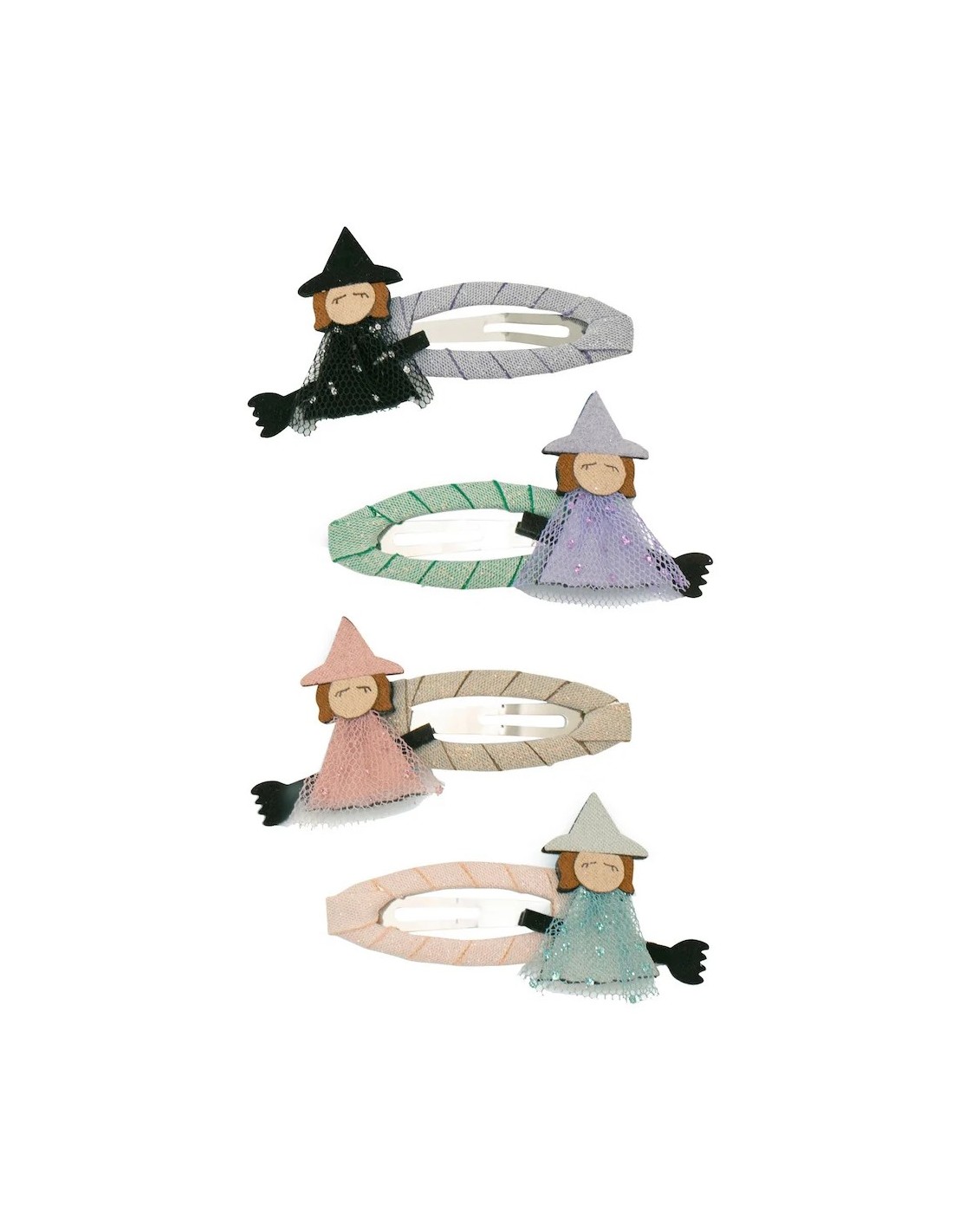 Mimi & Lula Witch Friends 4'lü Toka, küçük cadı figürlerinden oluşan renkli bir koleksiyon sunuyor! Sivri şapkalar, tül pelerinler ve minik süpürgelerle dolu bu set, Halloween eğlencesini saçlara taşımak için ideal.