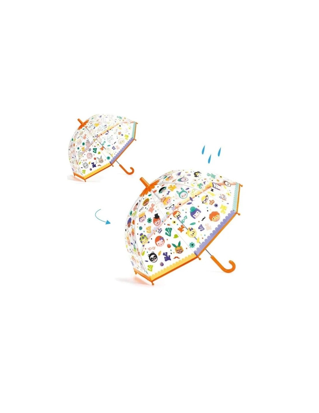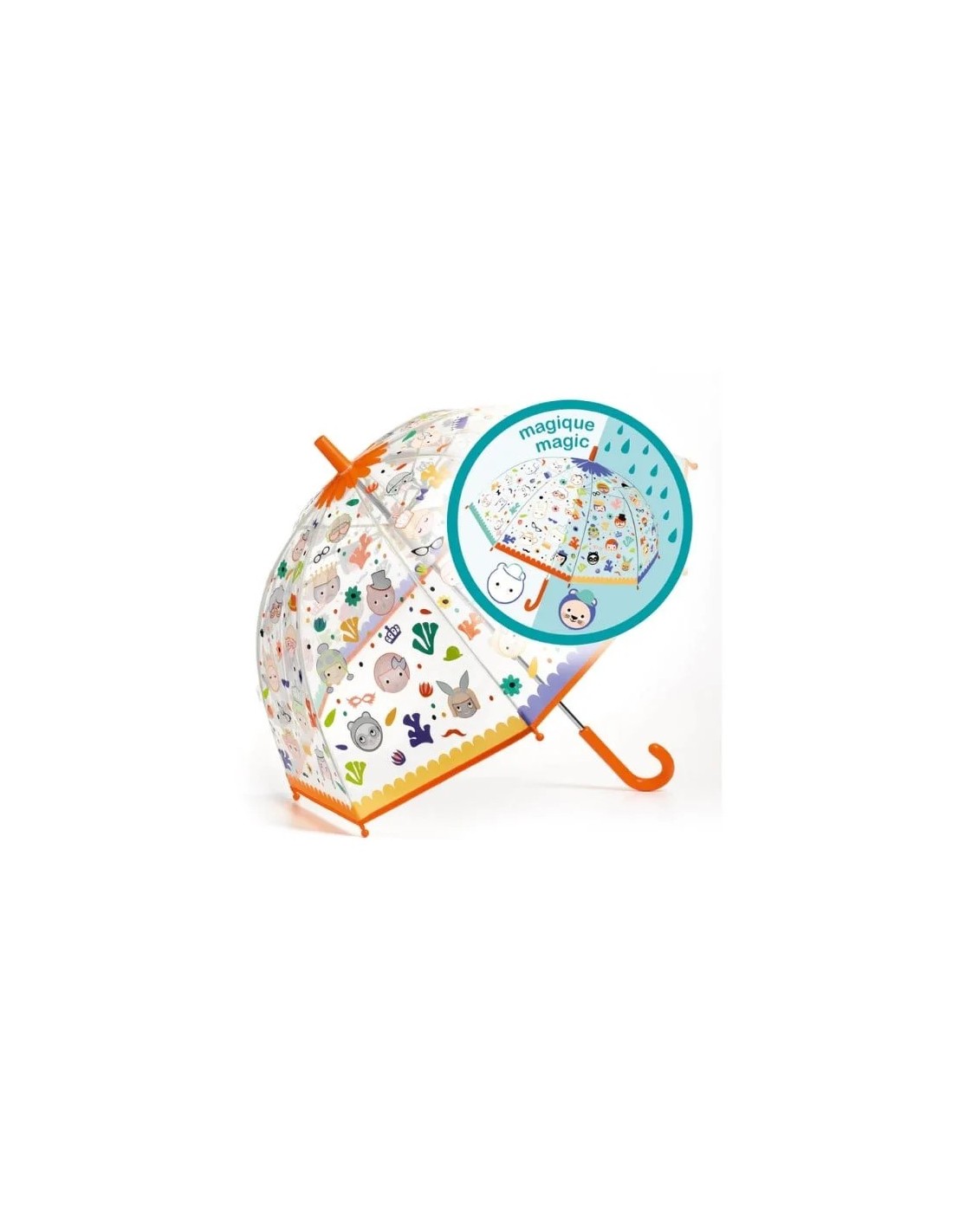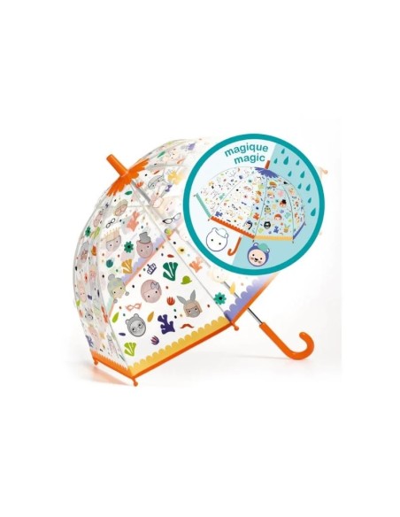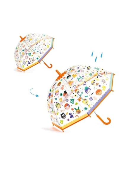 Suyla temas ettiğinde ortaya çıkan ve kuruduğunda kaybolan yüzlerle resmedilen şık ve pratik bir şemsiye.