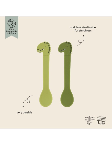 Yemeğinizin tadını çıkarmanız için dost canlısı yüze sahip iki renkli kaşık! Bunlar çocuğunuzu katı yiyeceklerle beslemek için ideal kaşıklardır. Kaşıklar, kendi başına yemeyi öğrenen çocuklar için de harikadır. Sağlamlık ve düz durmasını sağlamak için kaşığın içine entegre edilmiş paslanmaz çelik bir parça bulunmaktadır. Bu nedenle bu ürün diğer silikon çeşitlerine göre bir istisnadır ve mikrodalgada kullanılamaz. Silikon mutfakta kullanım için mükemmeldir. Kırılmaz, mikrodalgada, bulaşık makinesinde, derin dondurucuda ve fırında güvenle kullanılabilir. Yoğun kullanımda bile sofra takımları iyi durumda kalacak ve küçük erkek kardeşlere, kız kardeşlere veya arkadaşlara kolaylıkla devredilebilecek. %100 gıda sınıfı silikon, tüm Avrupa güvenlik standartlarına uygundur.