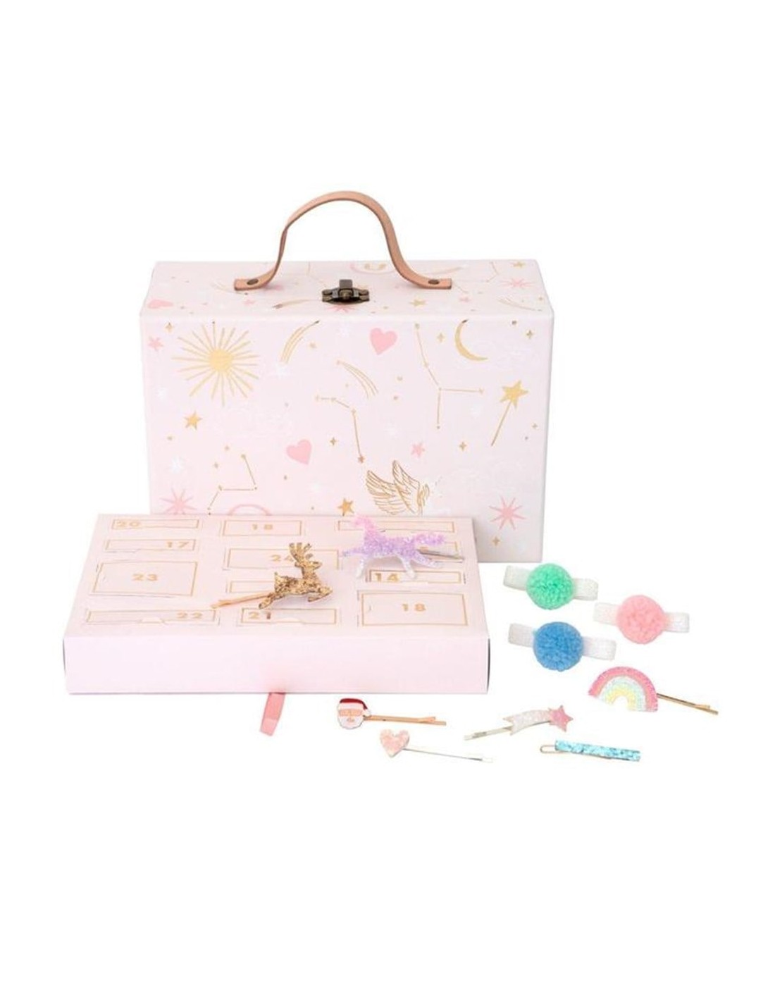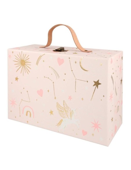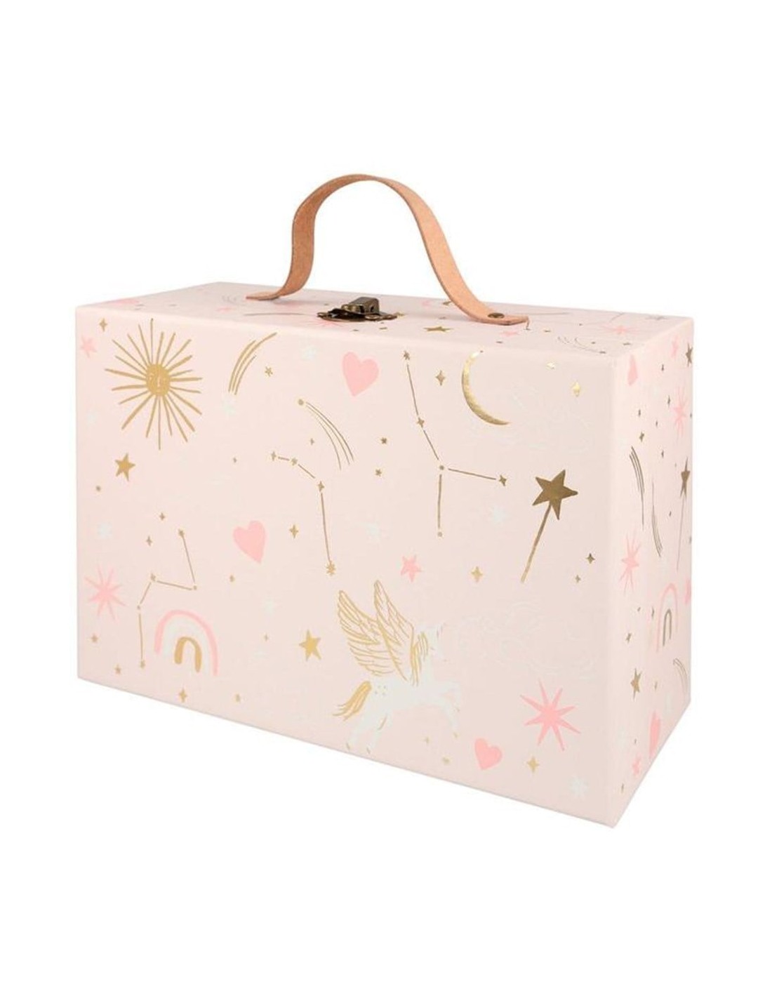 Pembe bavul, altın varak detaylı tasarımlara sahiptir.