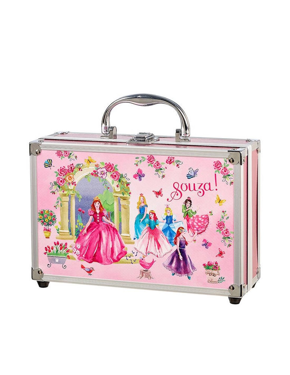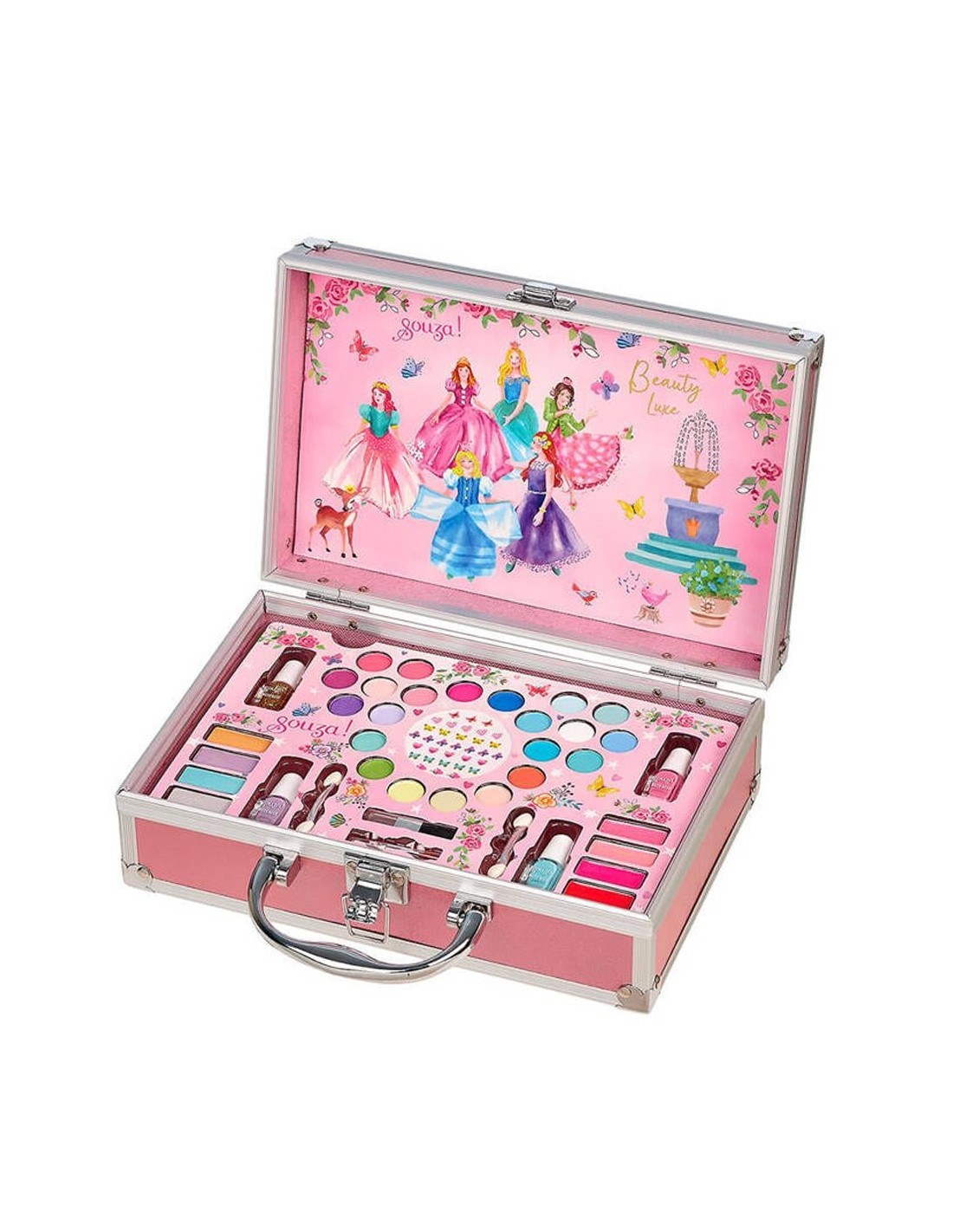 Souza’nın Hollanda tasarımı büyük makyaj seti, çocuklar için özel olarak hazırlanmış pratik ve eğlenceli bir kozmetik çantasıdır. Sevimli karton valiz içerisinde yer alan bu set, 4 oje, 26 renkli far, 4 krem ruj, minik tırnak çıkartmaları ve 4 uygulama süngeri içerir.