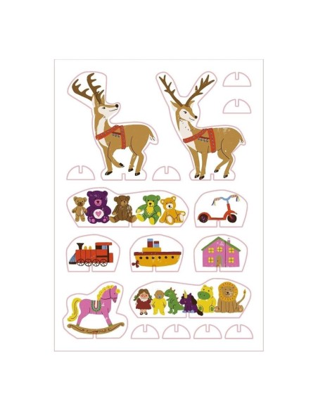 The box folds out into an illustrated, pop-and-play model of Santa’s Workshop, sure to inspire young imaginations. The workshop features 6 separate rooms over 3 floors, as well as a fold-out snowy landscape.