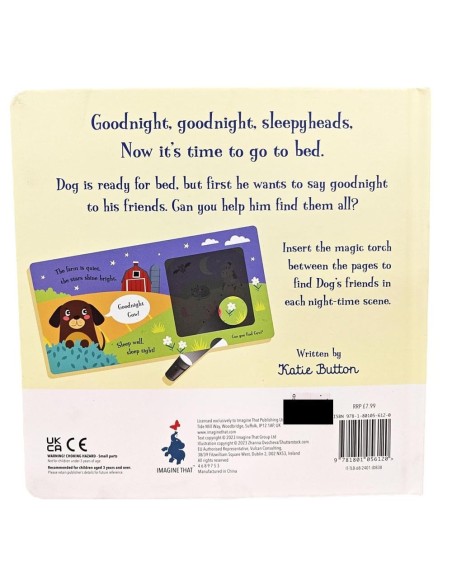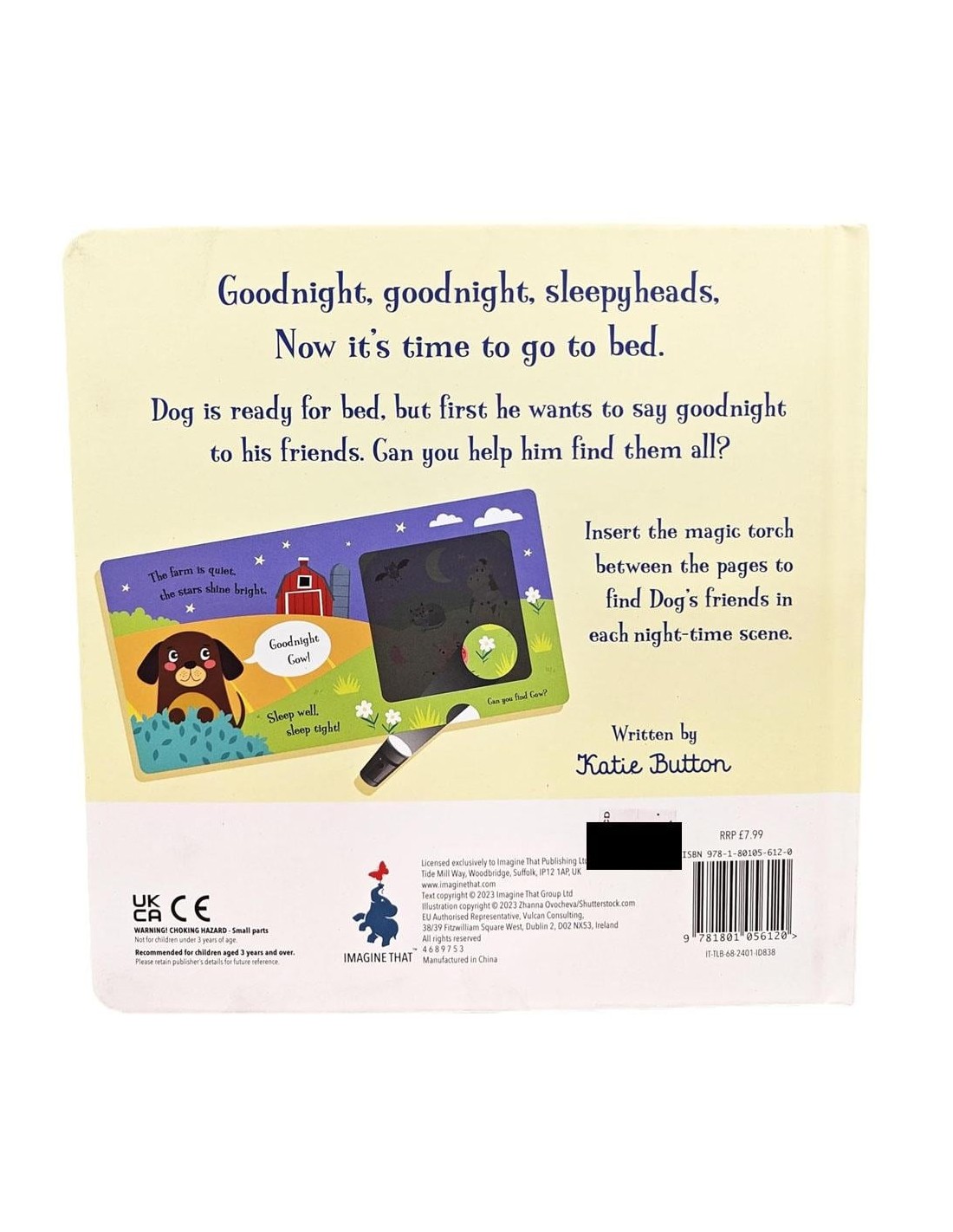 Dog is ready for bed, but first he wants to say goodnight to all his animal friends. Insert the magic torch between the pages to find Dog's friends in each night-time scene and watch children glow with delight!