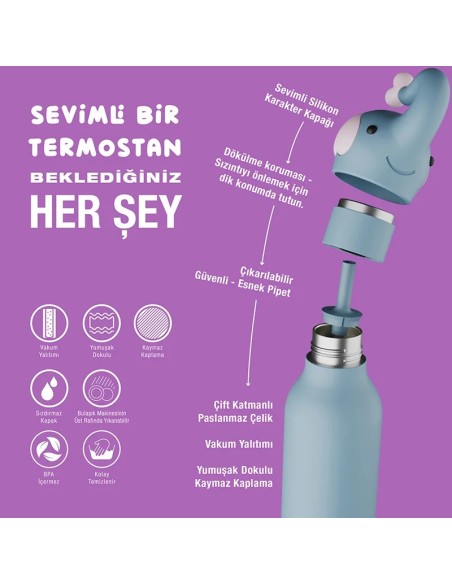 Silikon karakter başlığına sahip bu sevimli, yalıtımlı su şişesi, su içmeyi eğlenceli ve keyifli hale getiriyor.