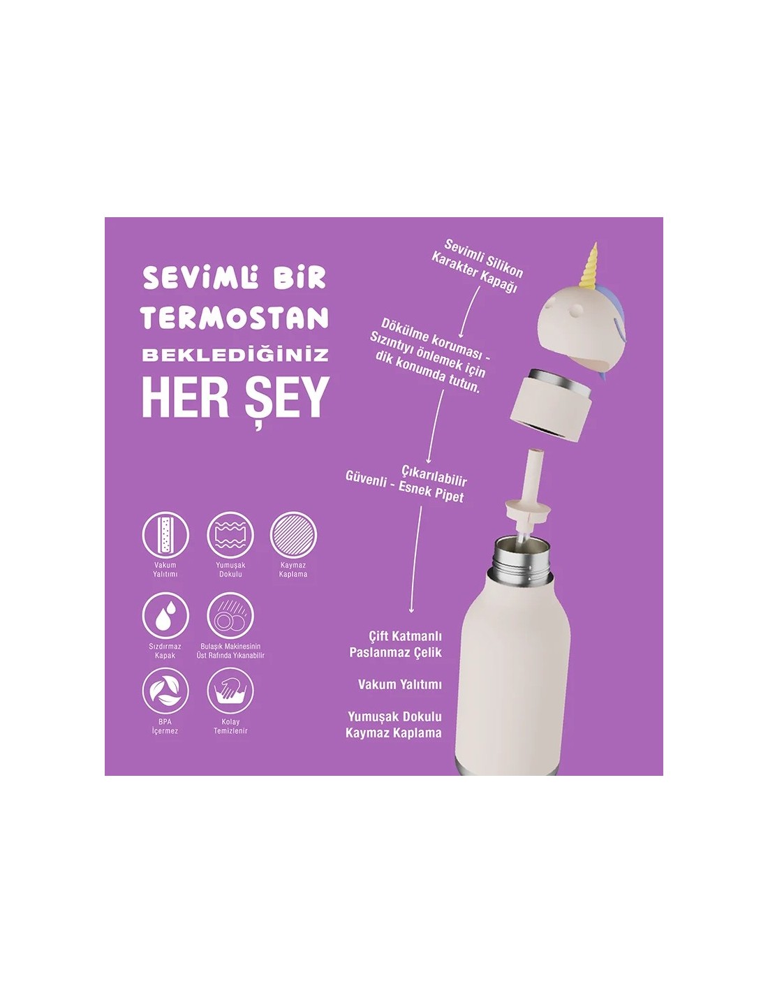 Silikon karakter başlığına sahip bu sevimli, yalıtımlı su şişesi, su içmeyi eğlenceli ve keyifli hale getiriyor.