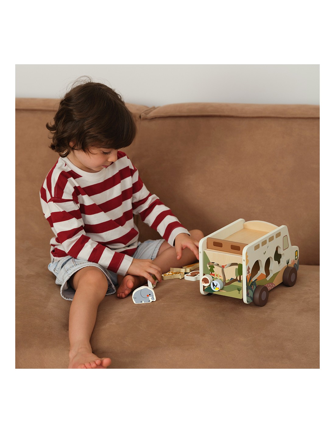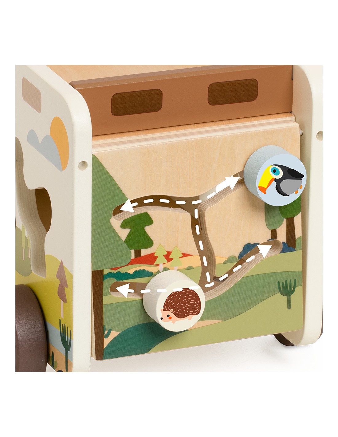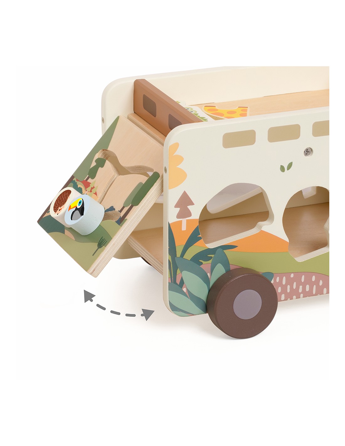 Çocuklar her bir şekli doğru boşluğa yerleştirirken aynı zamanda kaydırmalı parkurda hayvanları yönlendiriyor, kendi hikâyelerini yaratıyor ve oyunla öğrenmenin keyfini yaşıyor. FSC sertifikalı ahşaptan üretilen bu oyuncak, toksik olmayan renklerle boyanmış ve çocukların güvenle kullanabileceği şekilde tasarlanmıştır.