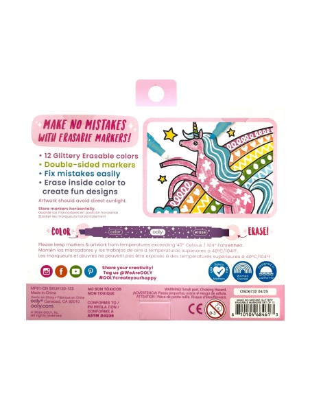 Ooly Make No Mistake Glitter Silinebilir 12’li Keçeli Kalem ile yaratıcılığınıza ışıltı katın! Simli renkleriyle dikkat çeken bu özel keçeli kalem seti, hem çizimlerinizi hem de notlarınızı parlatırken hata yapma endişesini ortadan kaldırır. Her bir kalemin bir ucunda simli renkli mürekkep, diğer ucunda ise sihirli silgi ucu bulunur; böylece çizimlerinizi kolayca düzeltebilir, detaylar ekleyebilir ve yaratıcı boşluk efektleri oluşturabilirsiniz. Ooly Make No Mistake Glitter Silinebilir 12’li Keçeli Kalem, çocuklar ve sanatla ilgilenen herkes için eğlenceli, pratik ve ilham verici bir deneyim sunar.