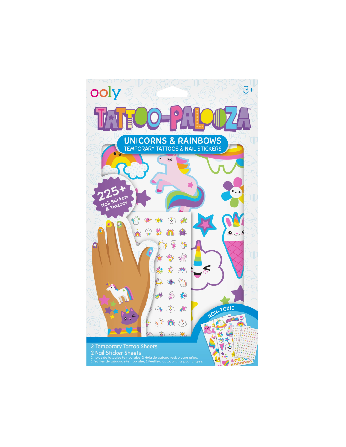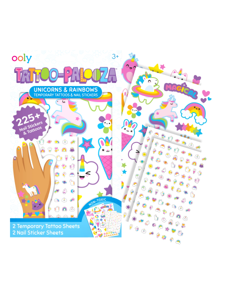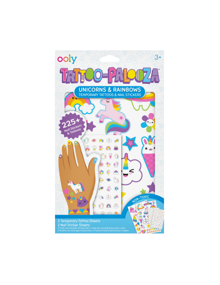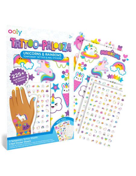 Ooly Tattoo Palooza Geçici Dövme ve Tırnak Sticker Seti - Unicorn & Rainbows, çocuklara kendi tarzlarını eğlenceli bir şekilde yansıtma imkanı sunuyor. Unicorn ve gökkuşağı temalı dövmeler ve tırnak stickerları, oyun saatlerini ve özel günleri çok daha renkli hale getiriyor. 225’ten fazla geçici dövme ve tırnak stickerı ile dolu bu set, doğum günü partilerinde, etkinliklerde veya evde yapılan kostüm oyunlarında çocuklara bambaşka bir deneyim yaşatıyor.Kolay uygulanabilir ve cilde güvenli yapısıyla hem pratik hem de eğlenceli bir kullanım sağlıyor.