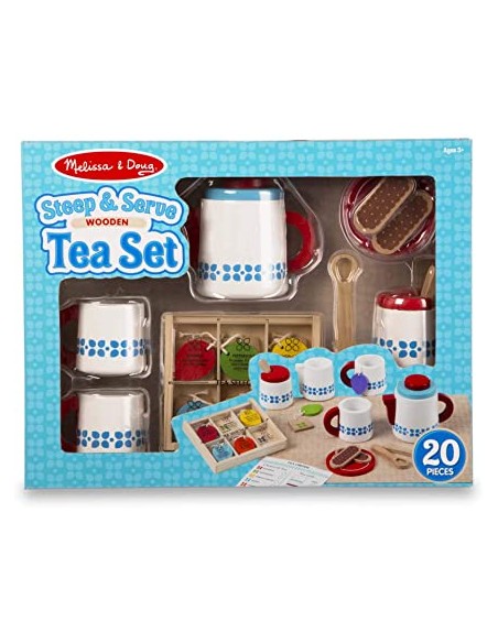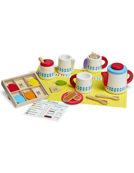Siparişinizi alabilir miyim? Bu 22 parçadan oluşan ahşap çay setinin içerisinde miniklerin çay partilerine ev sahipliği yapmaları için gereken herşey mevcut – çaydanlık ve kapağı, 2 kupa, 2 kaşık, şekerlik, sütlük, 6 çeşit meyve çayı, 2 lezzetli kurabiye, kurabiye tabağı ve mat. Meyve çayları özel kutusuyla sunulacak, siparişler sipariş kartına (silinebilir kalemle) yazılacak. İki kişilik çay partisine kim hazır? Okul öncesi çocuklar ve hatta daha büyük çocuklar için gerçek hayat senaryolarını canladırmak için mükemmel. Doğal olarak iletişim becerilerini, el-göz koordinasyonunu ve hafıza becerilerini geliştirir. Uyarı: Gerçek yiyecek ve içecekler için kullanılmaz, bulaşık makinesi, ocak, fırın ve mikrodalga fırın için uygun değildir.