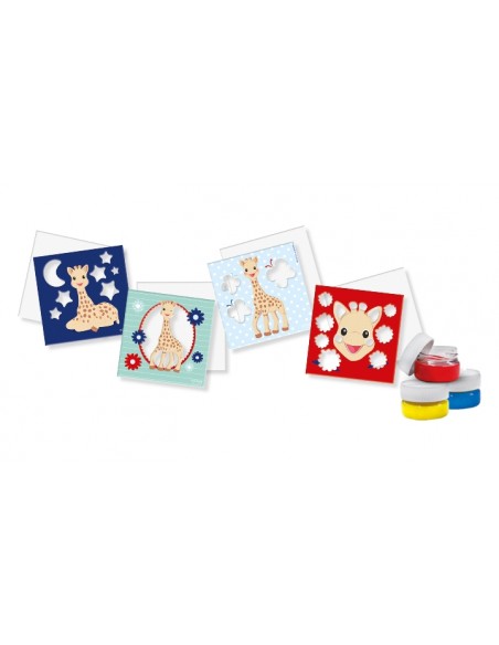 Sophie la girafe ile eğlenceli bir aktivite! Ses'in parmak boyaları ile en minikler bile harika sanat eserleri yaratacaklar. Kutu içerisinden çıkan beyaz kartlar parmak boyalarla boyandıktan sonra kartın üzerine boyalar kurumadan neşeli bir Sophie la girafe kartı yerleştirilir. Küçükler için harka bir eğlence ve sonuç her zaman mükemmel! 12 ay ve üzeri çocuklar güvenle kullanabilir. Kutu içinden 3 renk (mavi, kırmızı sarı) parmak boyaları, 4 beyaz kart ve 4 Sophie la girafe kartı çıkmaktadır.