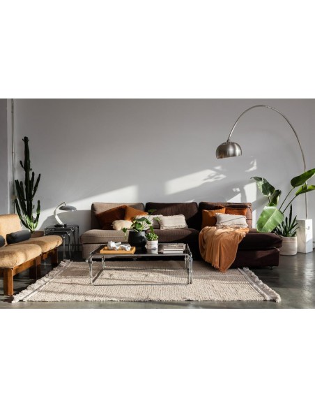 Bir yanda kontrast çizgili tasarım, diğer yanda nötr bir görünüm sunan Duetto halı, iki tasarımı tek parçada bir araya getiriyor.